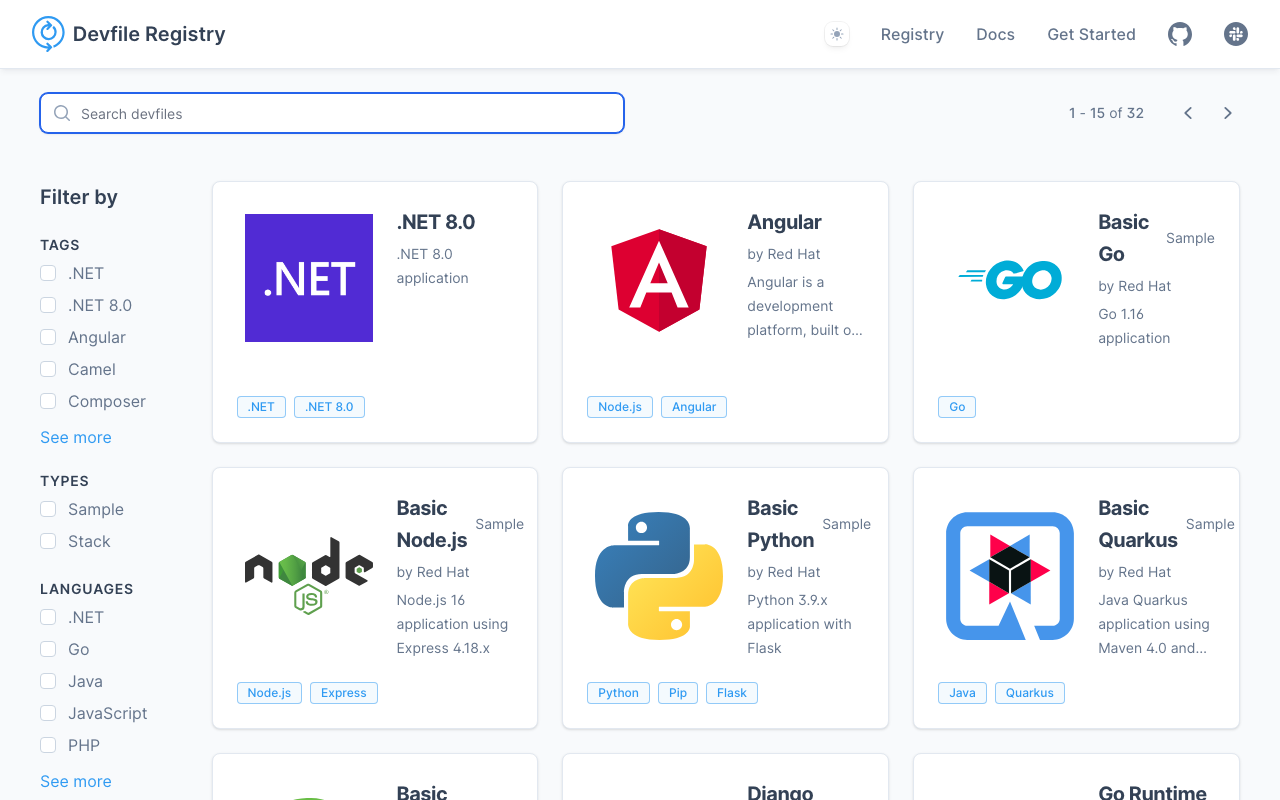 "This is the public devfile registry. Platform engineers use it as a starting point when creating devfiles for their teams. They can pick a stack, customize it with their organization’s tools and policies, and add it to their application repositories."
