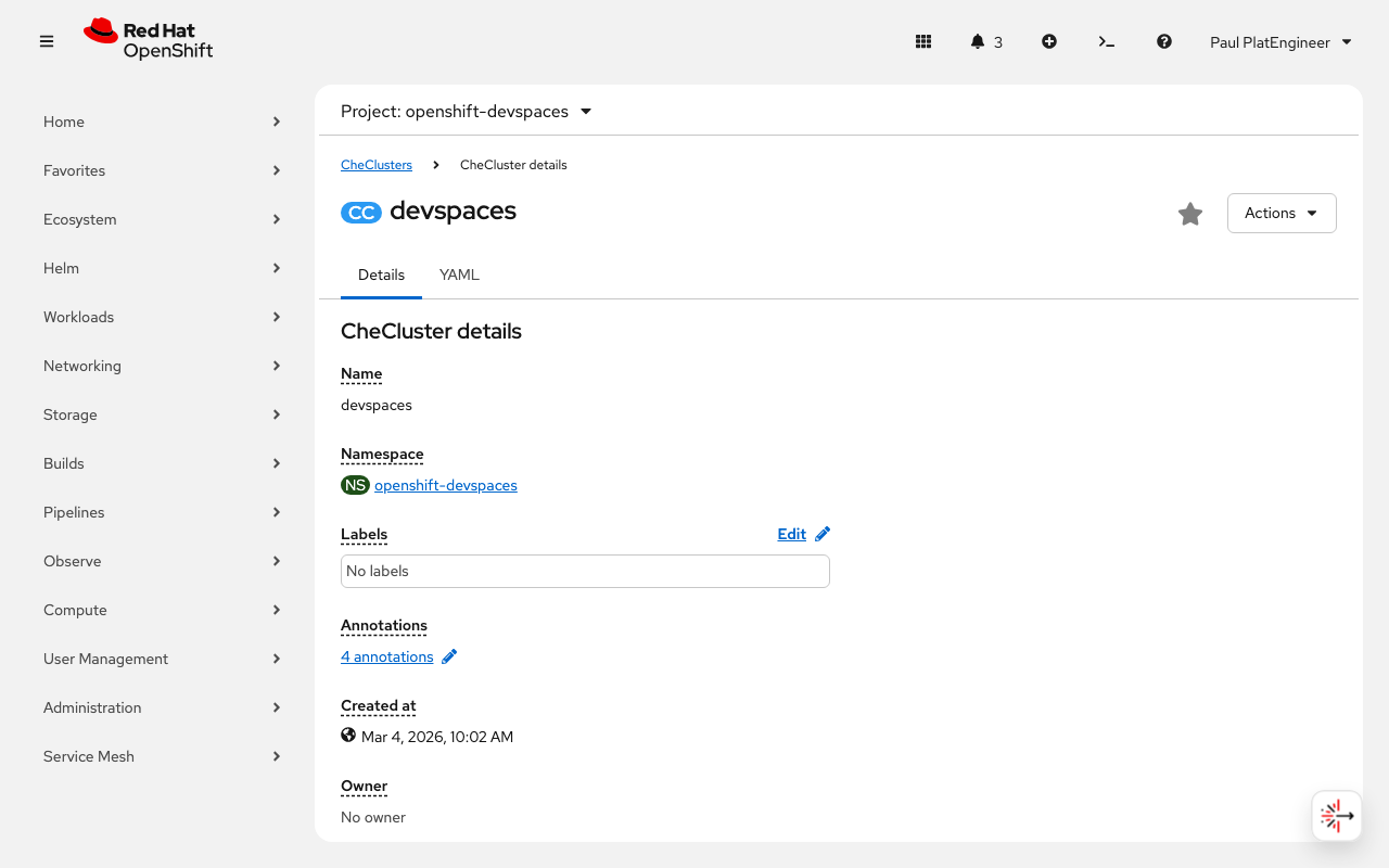 "We have seen the developer’s experience: click one button and get a fully configured workspace. But someone has to define and maintain that experience. Let me show you how the platform engineer manages DevSpaces for the organization."