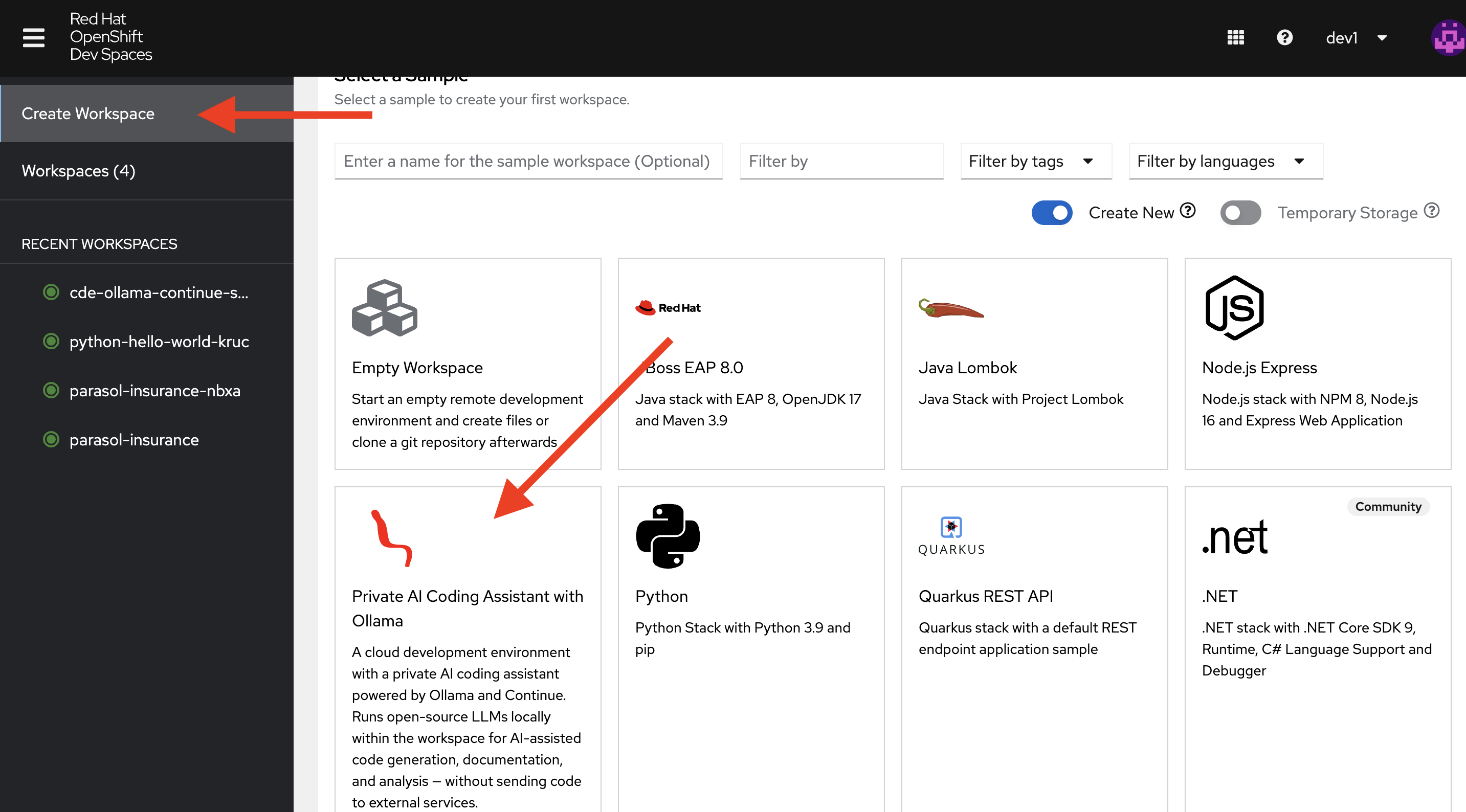 "The platform engineer just published a new workspace sample that gives any developer a fully private AI coding assistant running Ollama and Continue inside DevSpaces. No code leaves the cluster. Developers see this as a one-click option when creating a new workspace. This is how the platform team curates the developer experience."