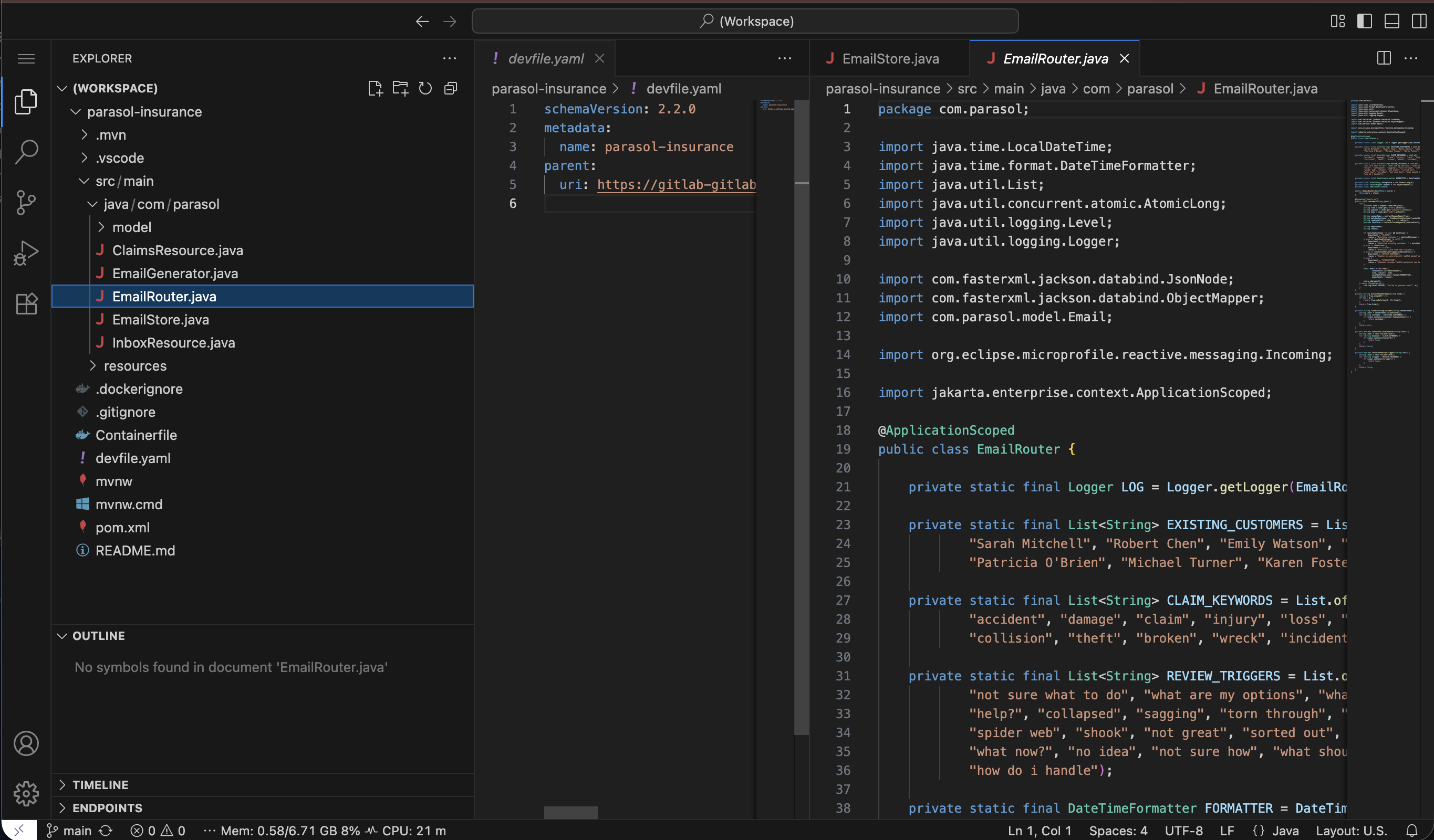 Our new developer is now in their cloud workspace and ready to contribute. But first, let them explore the application. Parasol Insurance is a claims and customer management platform used by Parasol’s agents to process insurance claims and communicate with customers. It uses enterprise messaging with Apache Kafka to process incoming emails through a keyword matching algorithm that routes them to the appropriate department. (This routing will be enhanced with AI in Section 3.) The developer has been assigned their first task: add a new claims statistics API endpoint. Using Quarkus dev mode, they can write code and see changes reflected immediately without manual builds or restarts. However, in their eagerness to ship, the developer takes some shortcuts — using System.out.println instead of proper logging and wrapping code in an empty catch block — code smells that will have consequences in Module 2.