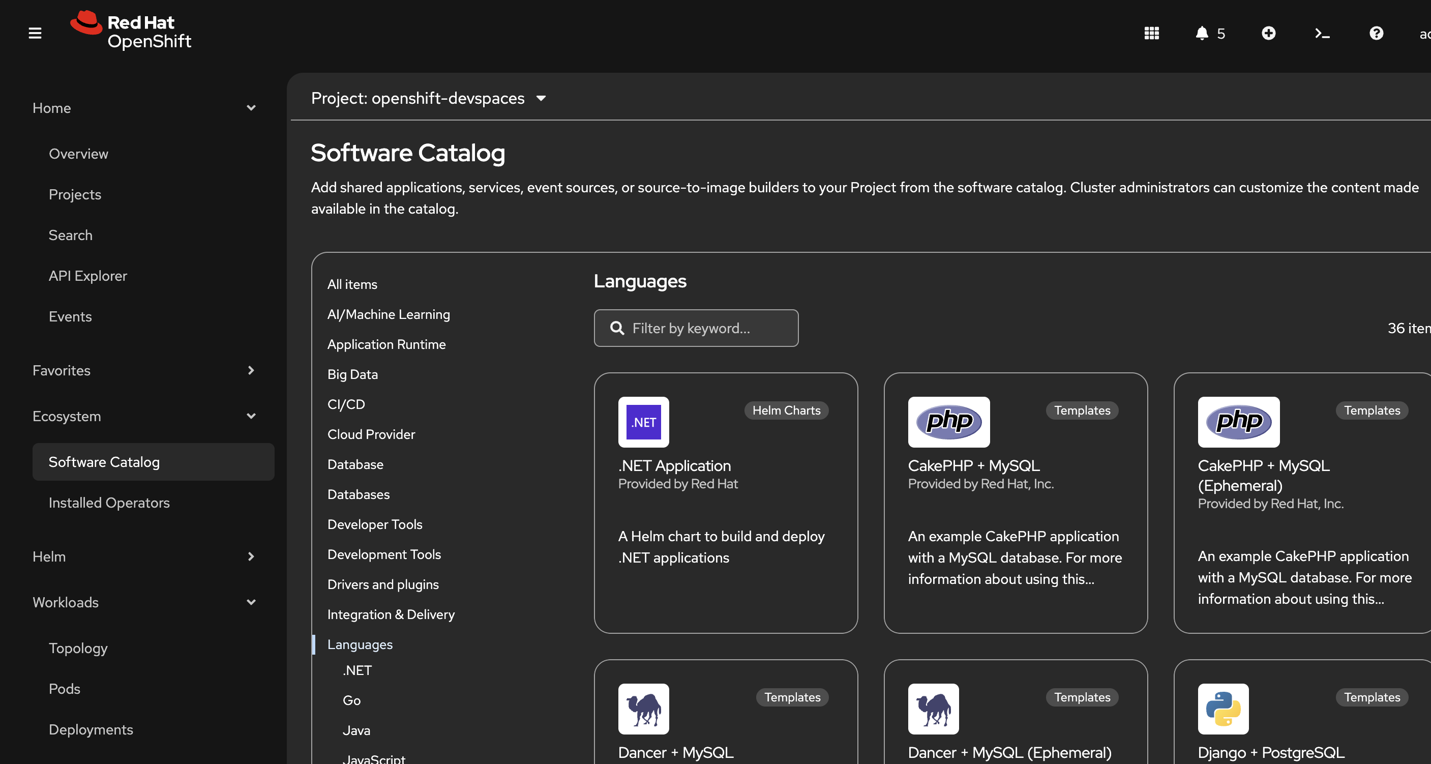 Show the available, customizable categories of pre-vetted services that developers and platform engineers can use when working directly in OpenShift. Platform engineers can customize this for their environment. For example, the platform engineer can set up a shared database service that developers can connect to from their applications without needing to configure credentials or network access, or remove access to certain services that are not approved for use in development environments.