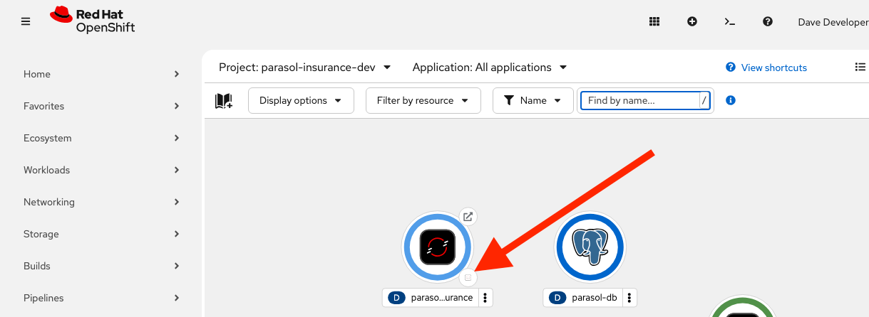 "This is the Parasol application running on OpenShift. The developer can see all the components and their status at a glance."