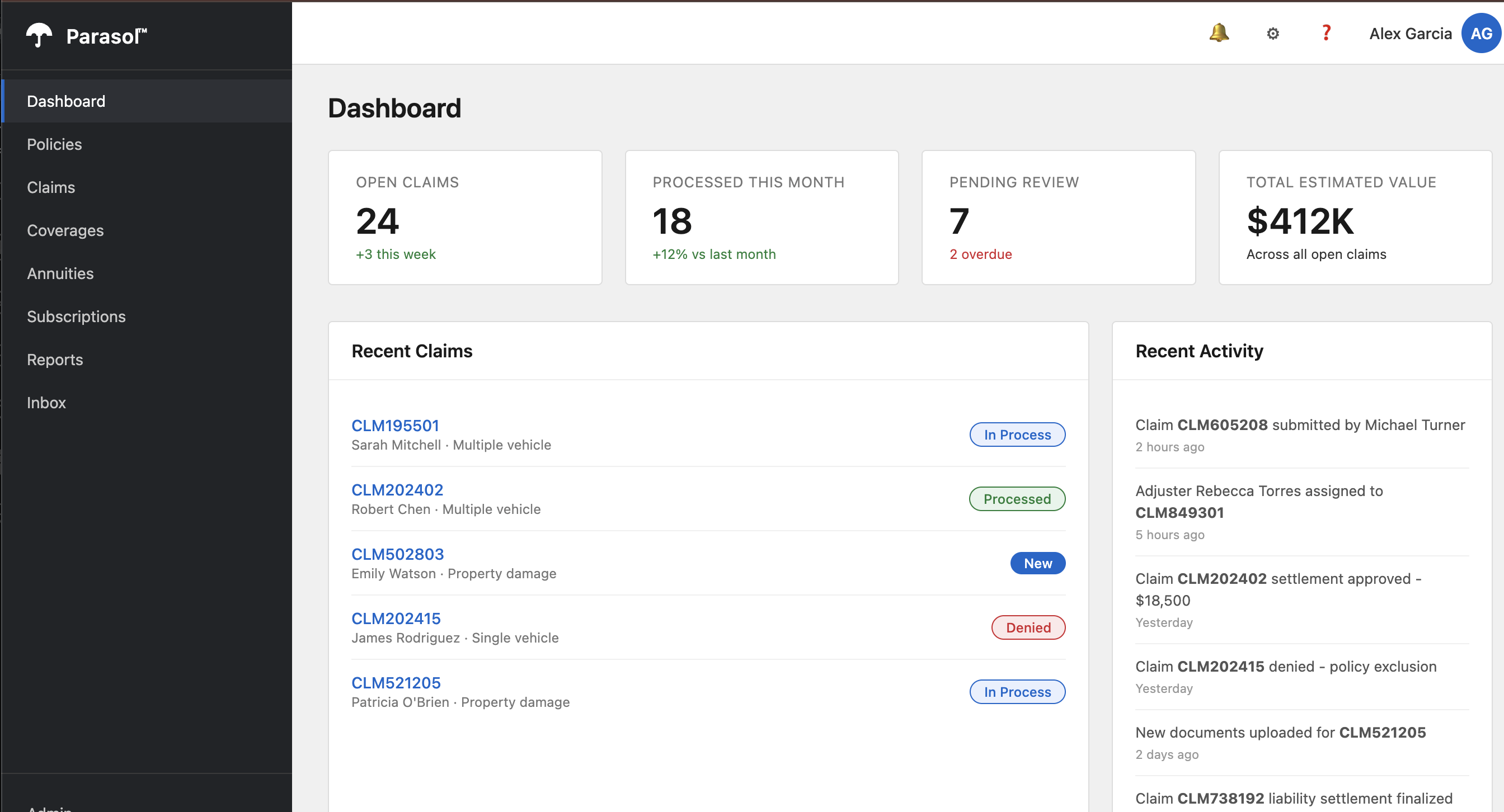 "This is the Parasol Insurance platform. It is used by Parasol’s agents to manage insurance claims and communicate with new and existing customers. Behind the scenes, it uses Apache Kafka for enterprise messaging — incoming customer emails are processed through a keyword matching algorithm that routes them to the correct department: claims, retention, or acquisition. We will come back to that email routing in Section 3, where we enhance it with AI."