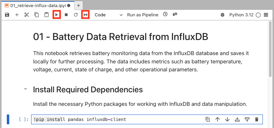 At this point, you can follow the instructions contained in each Notebook. Those will explain each step in detail. Pay attention to some of the variables used during the execution. You will need to replace some of them based on your environment. For example, in the first notebook you will need to replace the InfluxDB URL with yours: