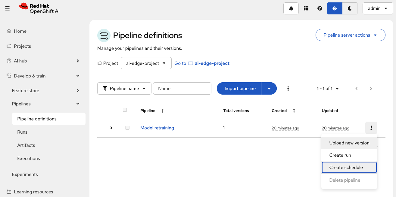 In the Red Hat OpenShift AI (RHOAI) Dashboard, navigate to the Pipeline definitions tab