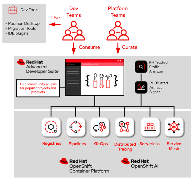 Red Hat Advanced Developer Suite (RHADS) scales platform engineering teams to increase developer productivity and reduce software supply chain risk in hybrid and multicloud environments. It is designed to balance speed and security, integrating into existing organizational workflows. The suite brings together an enterprise-grade developer portal, enhanced software supply chain security capabilities, and components that empower platform engineers to enhance developer productivity and streamline the software development lifecycle.