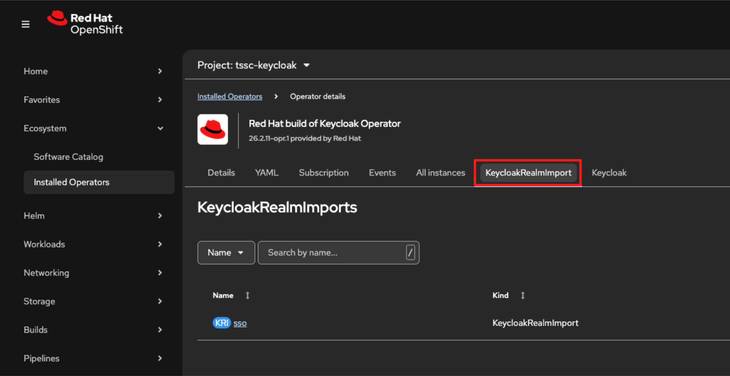 Switch back to the KeyCloakRealmImport tab in the OpenShift console. You will see that the import job has started: