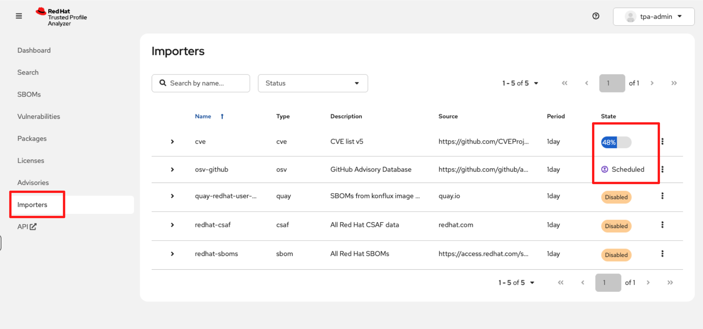 These importers pull upstream vulnerability intelligence daily, enabling RHTPA to match component identifiers from SBOM documents against known advisories (NVD and GitHub Security). Without importer data, correlation would return empty results.