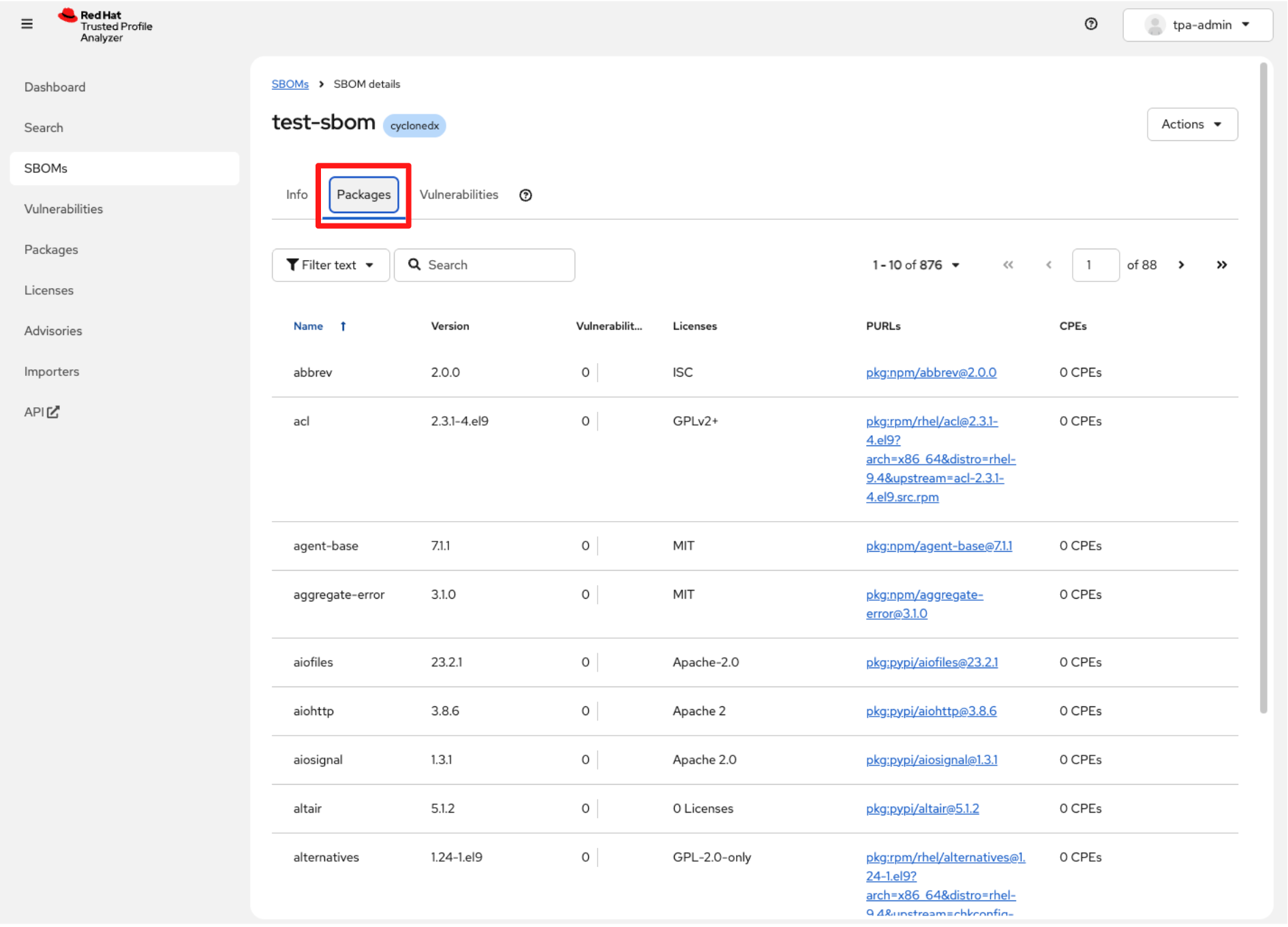 Switch to the Packages tab. RHTPA shows an inventory of all packages contained in the SBOM you uploaded.