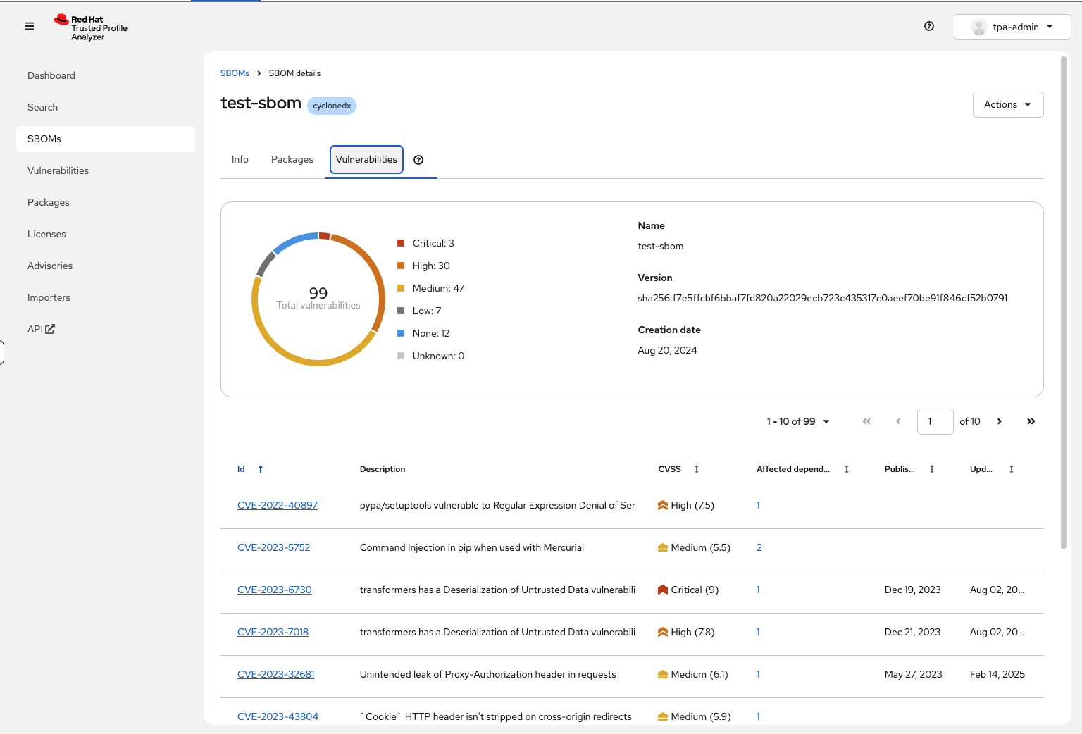 Why is the vulnerability report empty? If the test-sbom entry shows zero vulnerabilities, this is expected in a fresh installation. Reason: RHTPA relies on background importer jobs to download large vulnerability advisory datasets, including the National Vulnerability Database (NVD), the U.S. government’s authoritative CVE repository, and GitHub Security Advisories. These datasets must be fully synced before RHTPA can correlate vulnerabilities with SBOM components. The initial sync can take significant time, especially in new environments. |