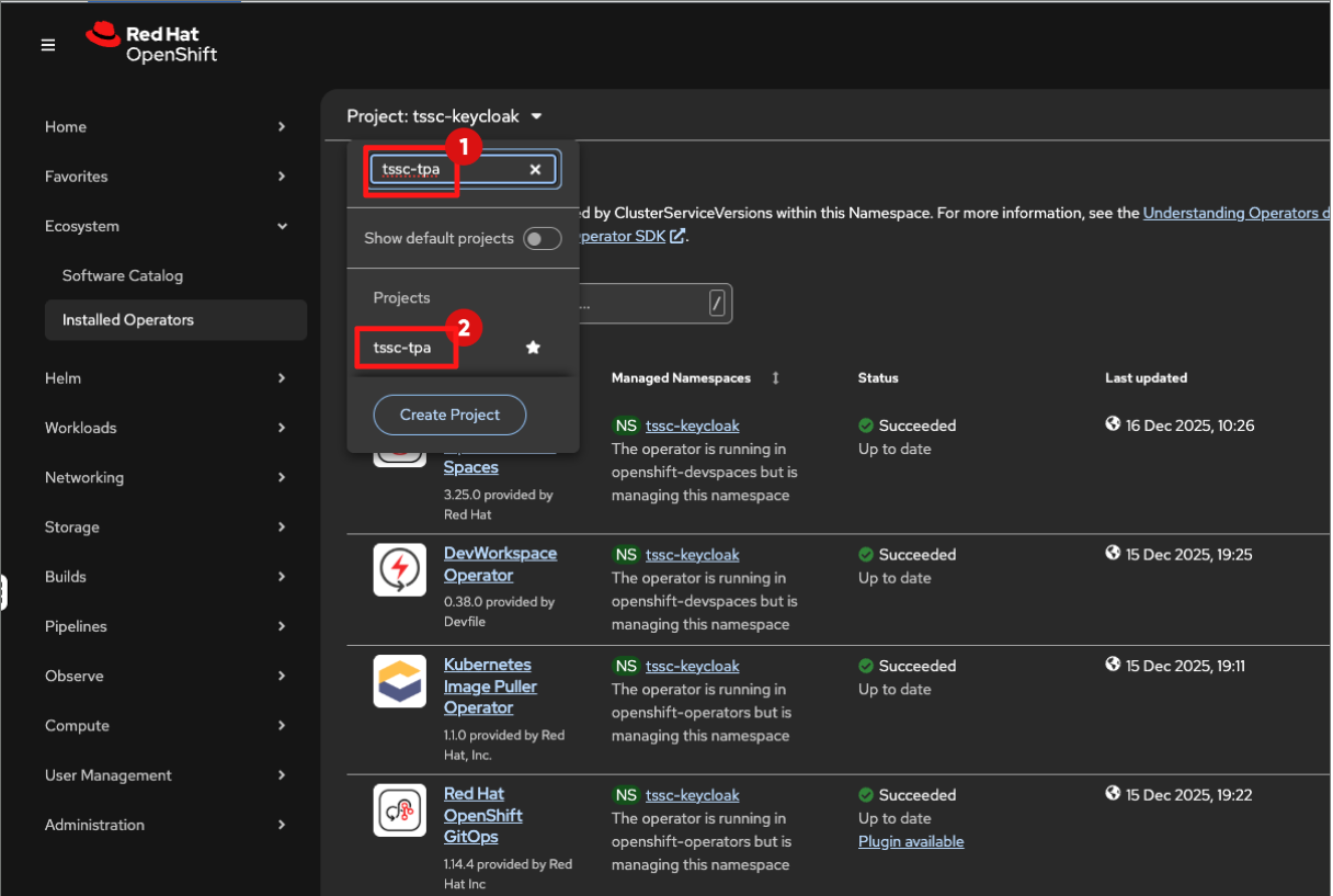 Before importing the tpa realm, switch to the OpenShift Console to monitor the realm import job.