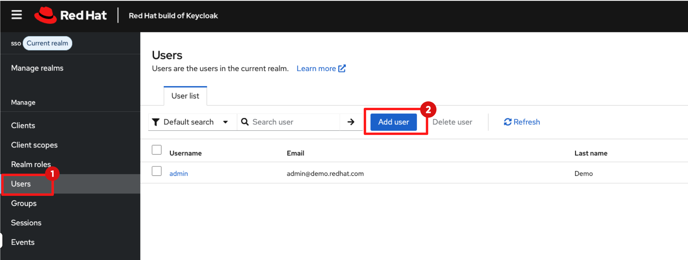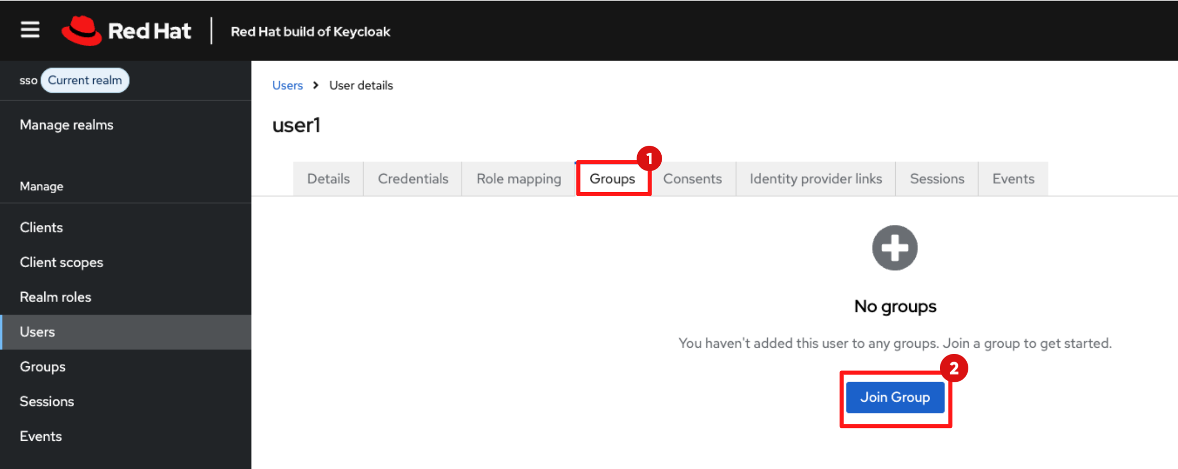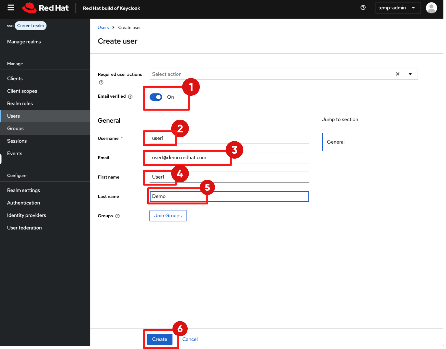 Before enabling Red Hat Developer Hub (RHDH) features, you need to create a developer identity. In this step, you will create a developer user (user1) in the sso realm. Typically a developer identity will already exist, for example from LDAP or the organisation’s existing SSO system.