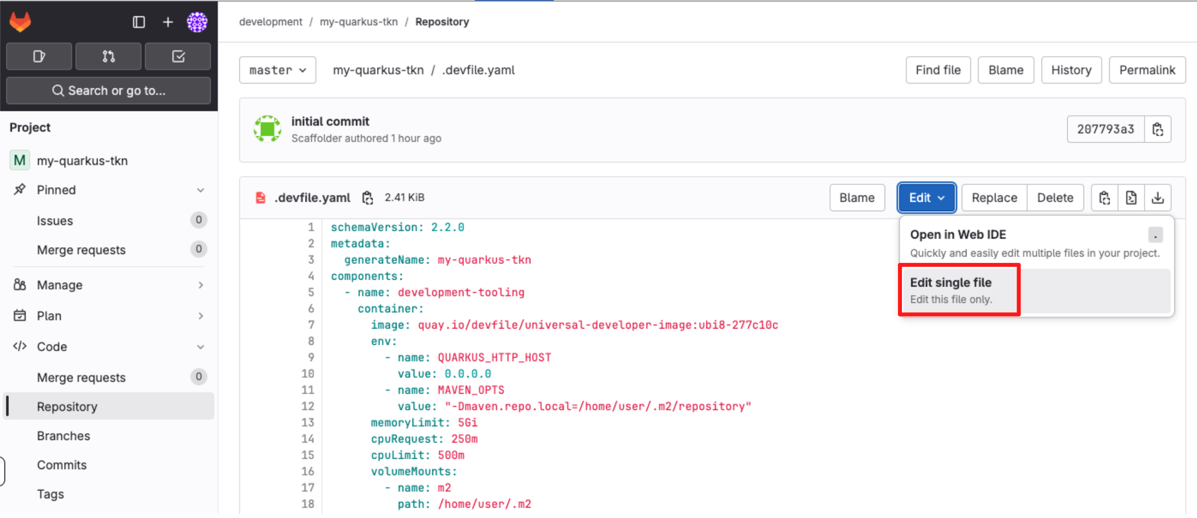 Select the the file devfile.yaml.