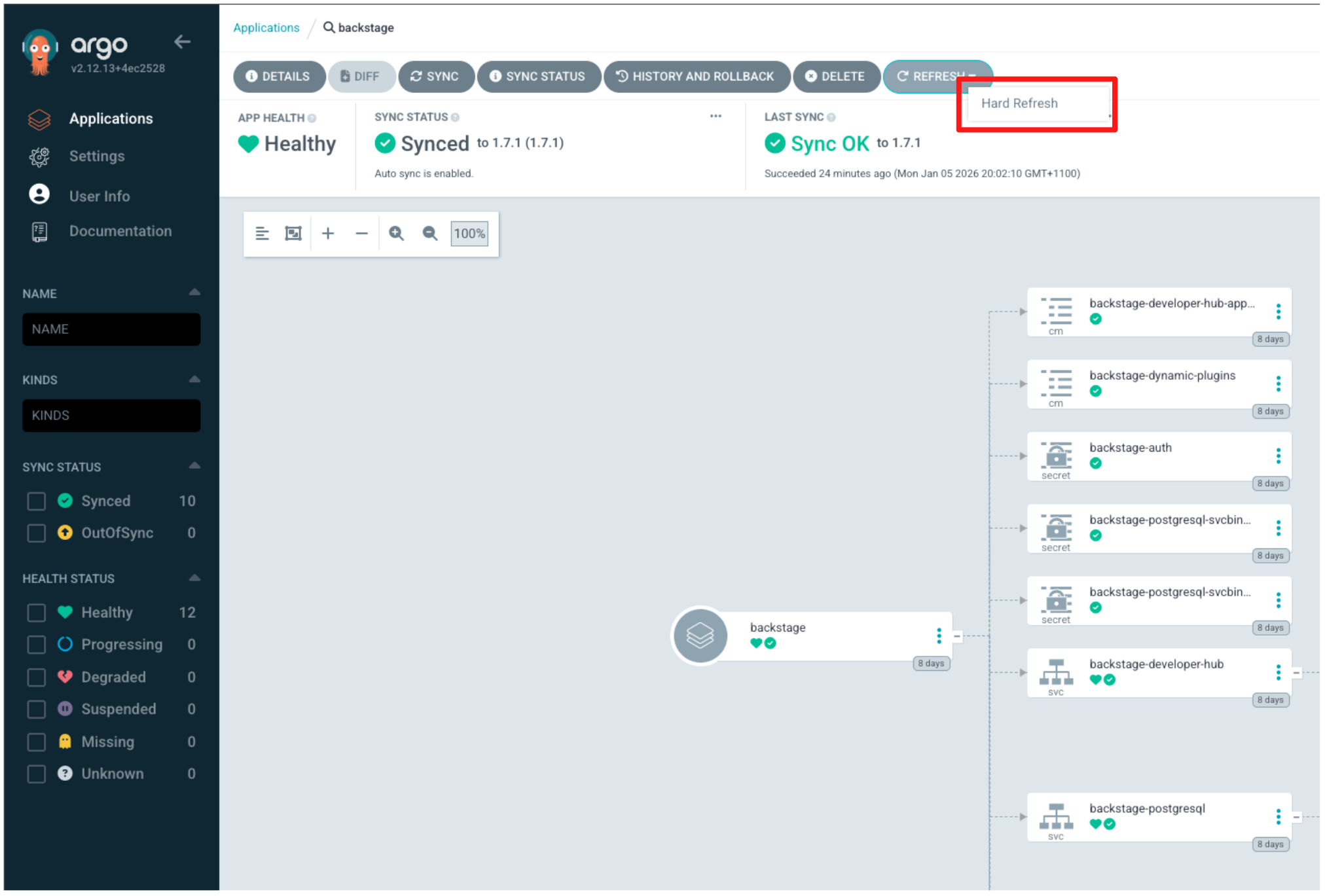 Argo CD is configured to automatically synchronise every two minutes. To avoid waiting for the next sync cycle, trigger Hard Refresh to trigger an immediate reconciliation.