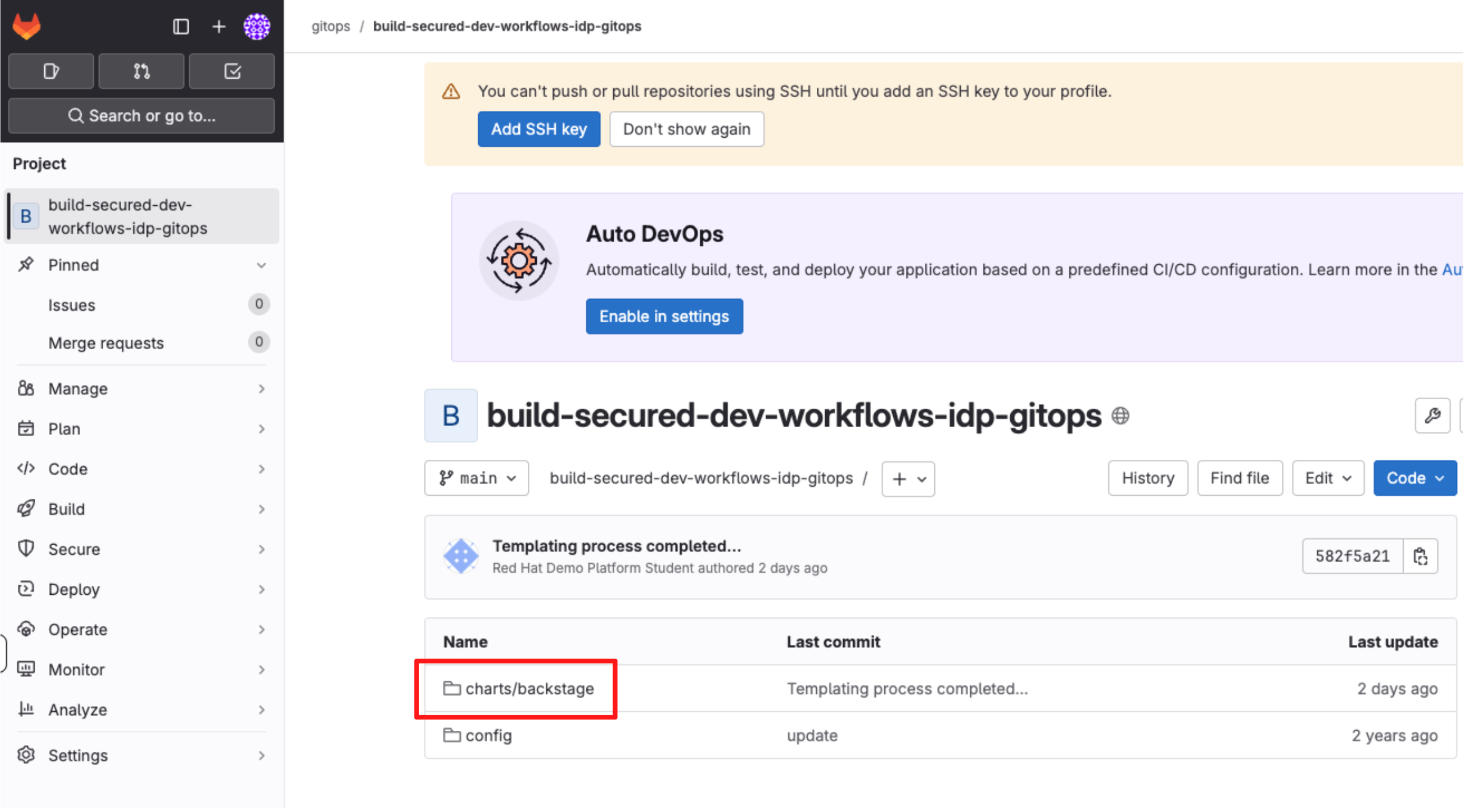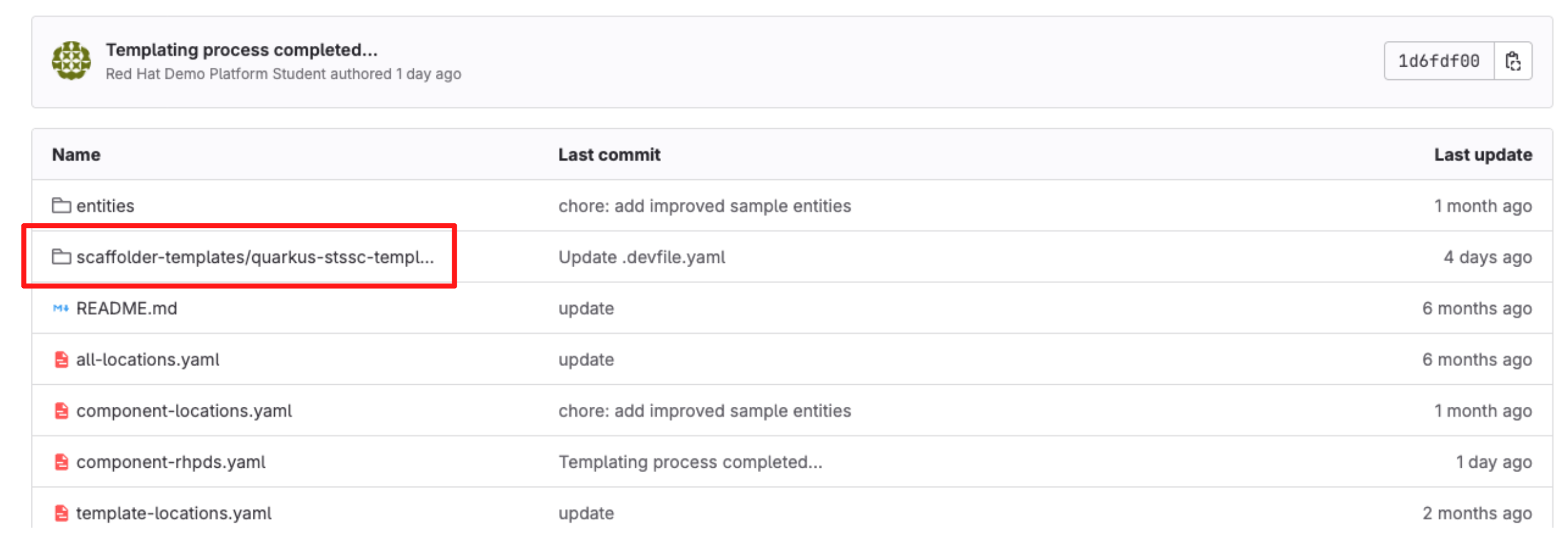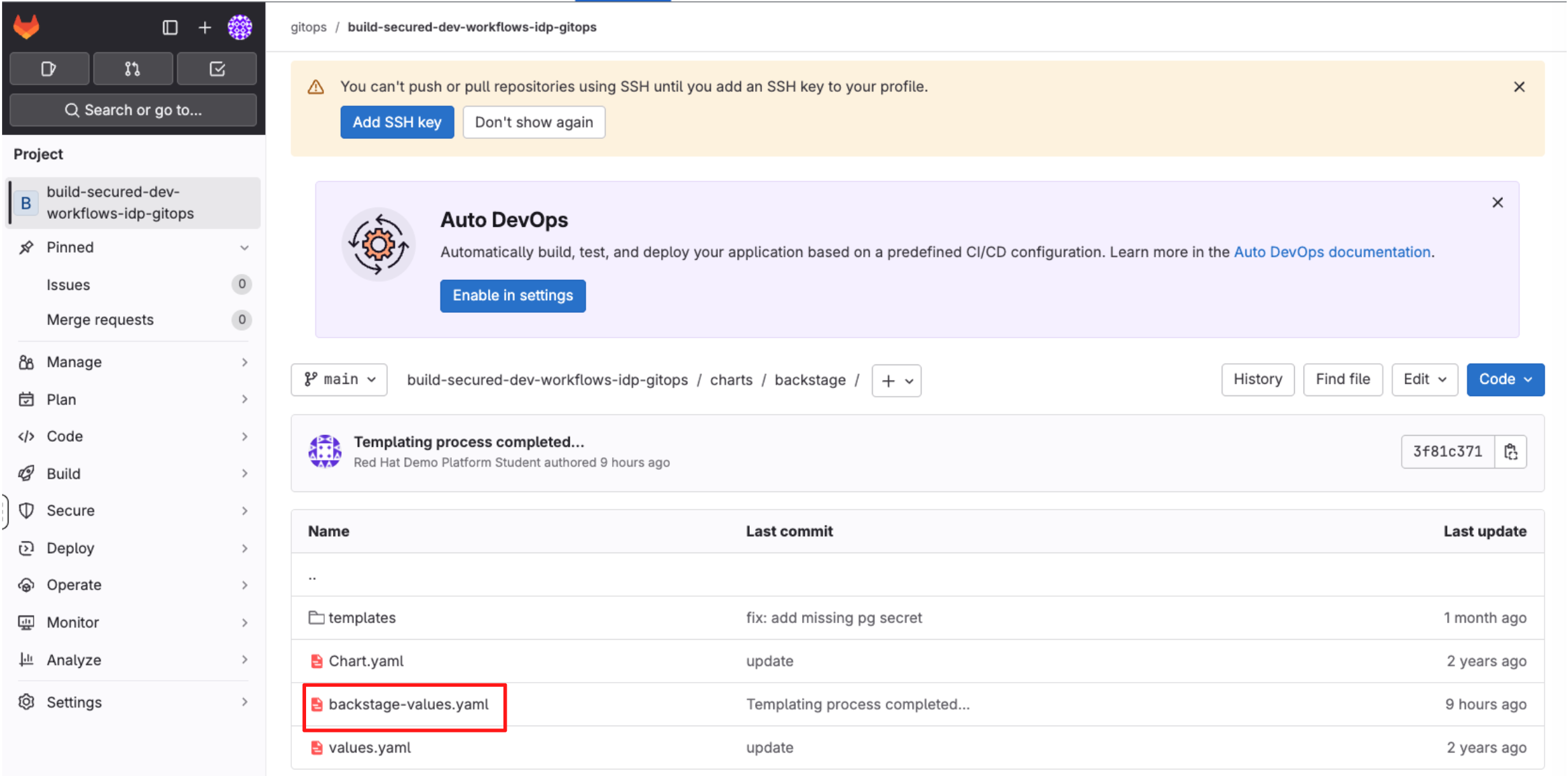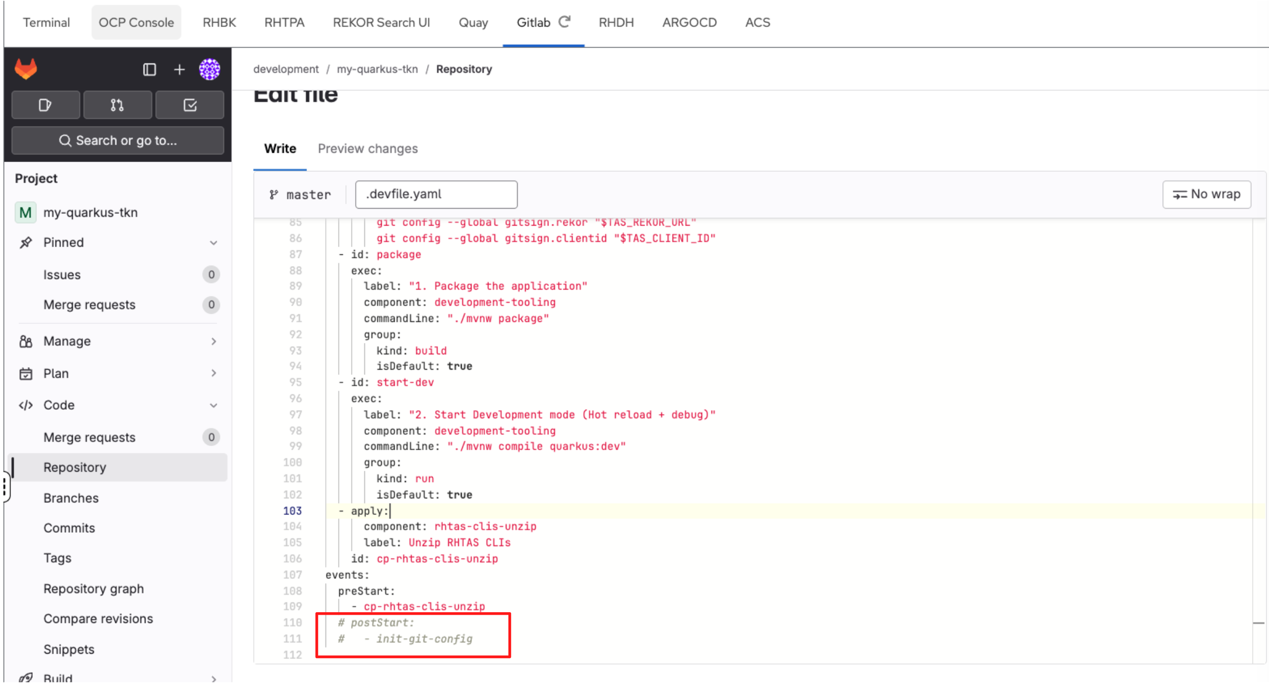 In this section you’ll act as a Platform Engineer and update the Devfile in a Template (Golden Path) that developers will use to create new applications. The update you make ensures that commit signing is enforced in new projects created using the template.