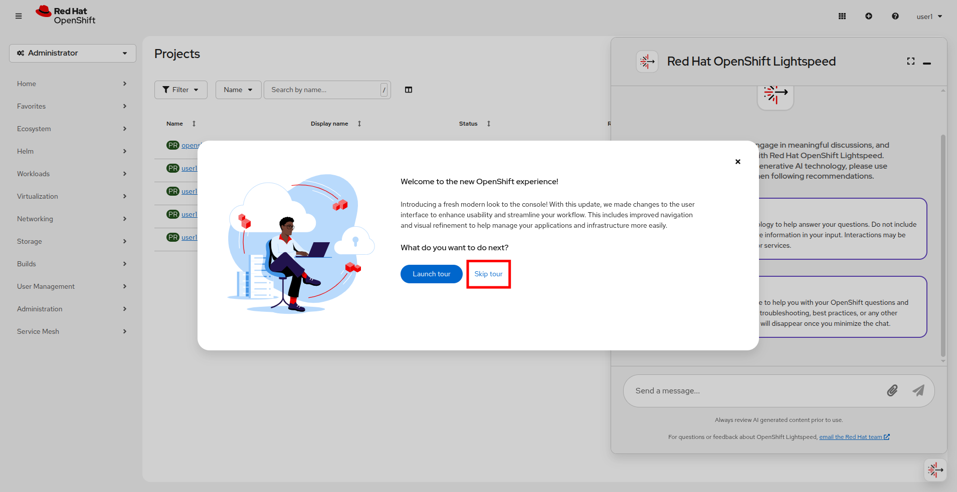 You will be welcomed to the new OpenShift UI, please click on Skip tour on this window.