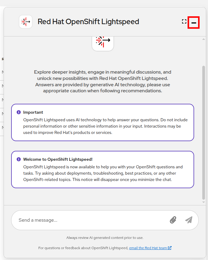 Also, you may notice that the OpenShift Lightspeed window is taking up a significant amount of console real estate on initial launch, please minimize this window for now until we are ready to use it.