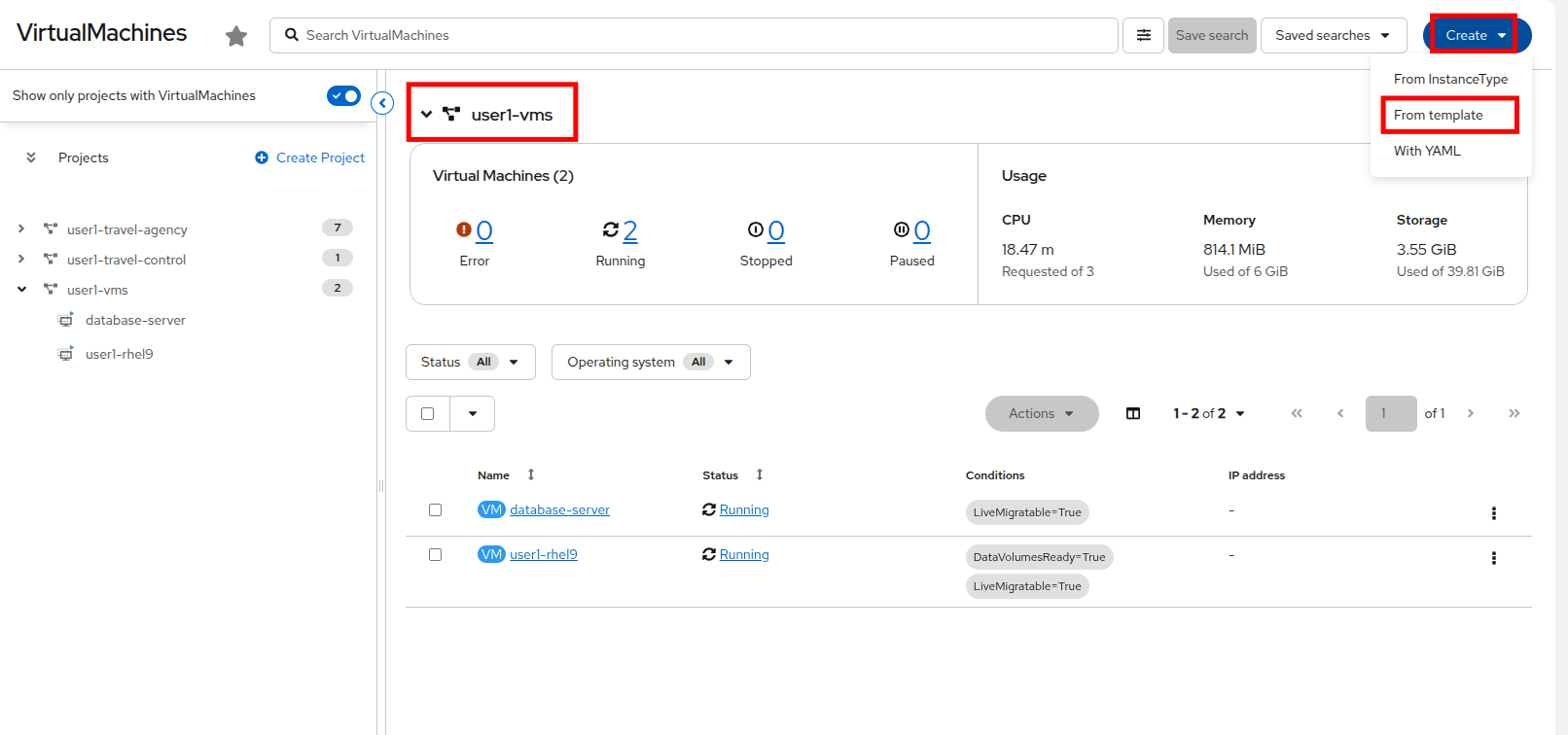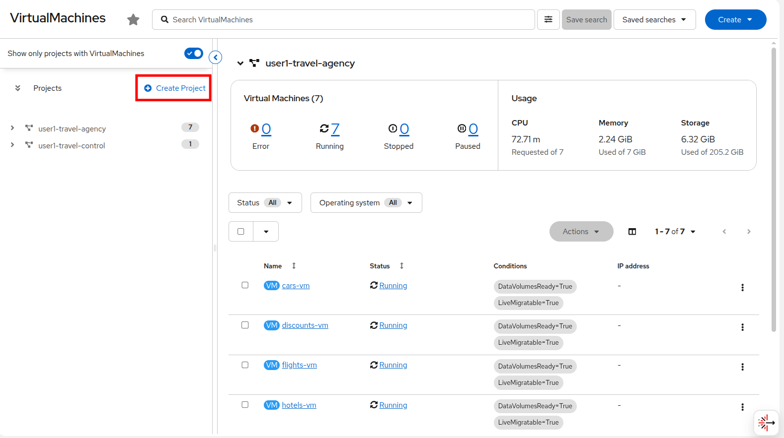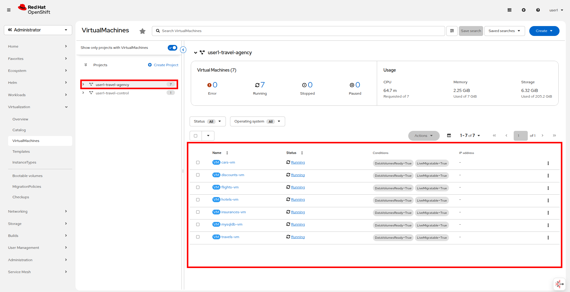 Click on the userX-travel-agency namespace in the center column to see that there are already a number of virtual machines running in the cluster.