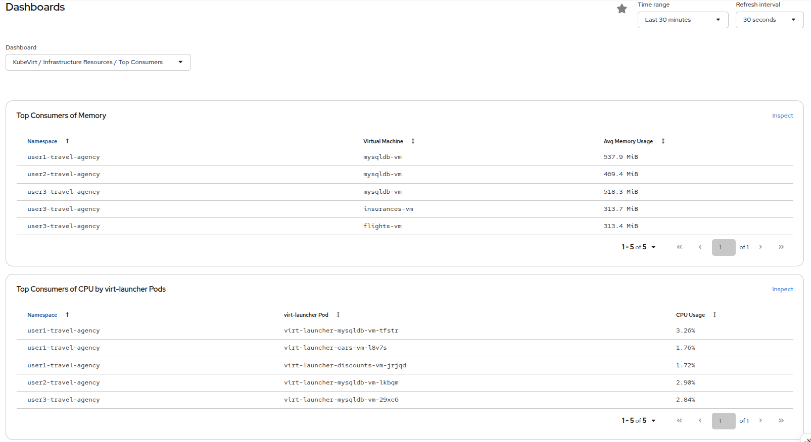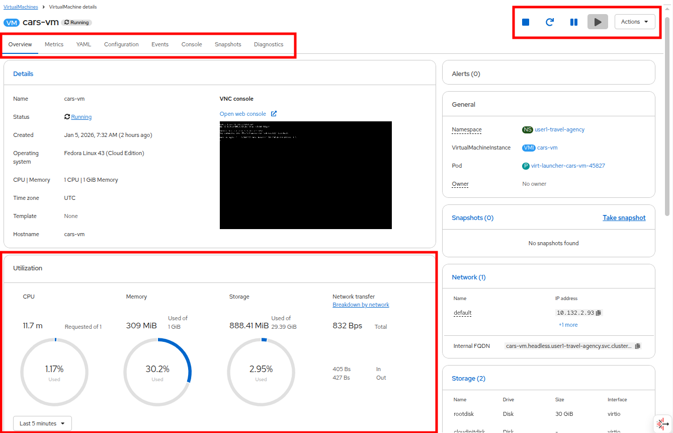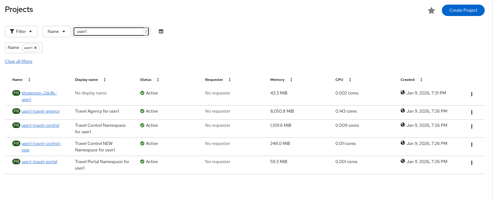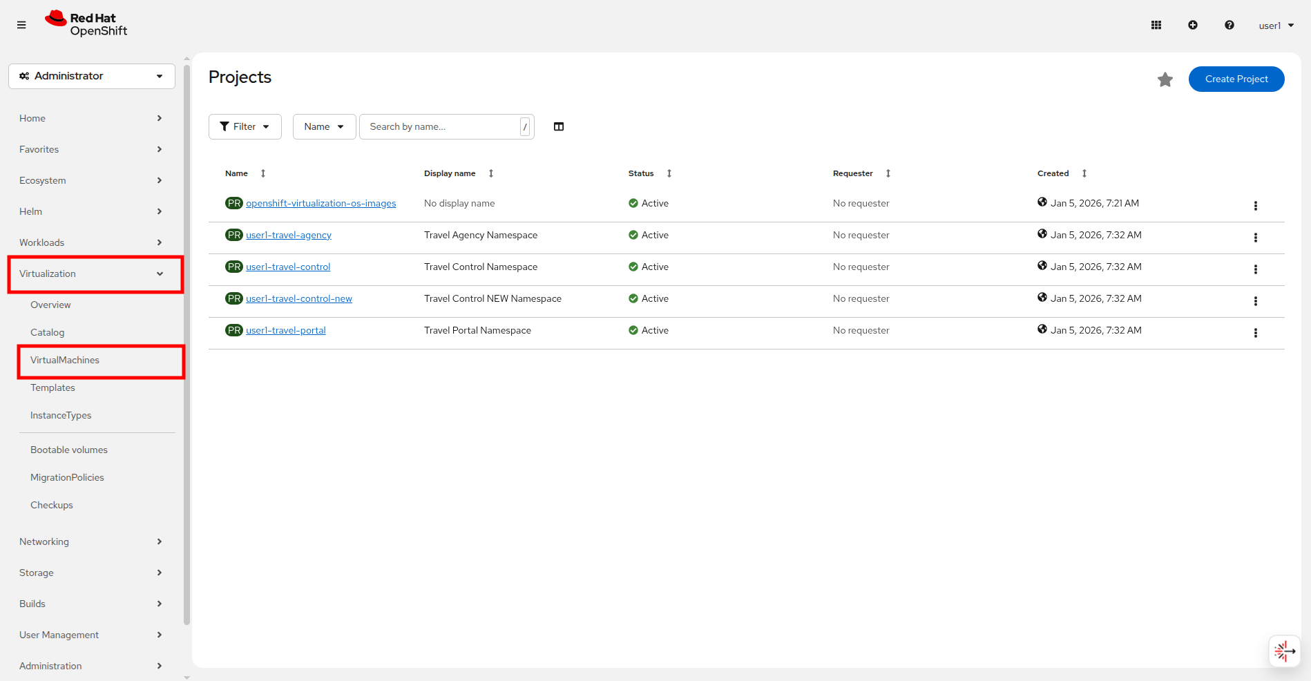Click on the userX-travel-agency namespace in the center column to see that there are already a number of virtual machines running in the cluster.
