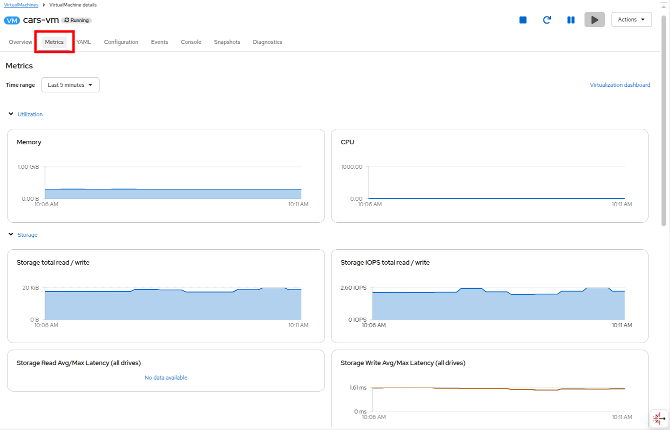 This gives you an overview of the VM metrics like memory and CPU consumption, storage and networking performance data if you scroll down the page.