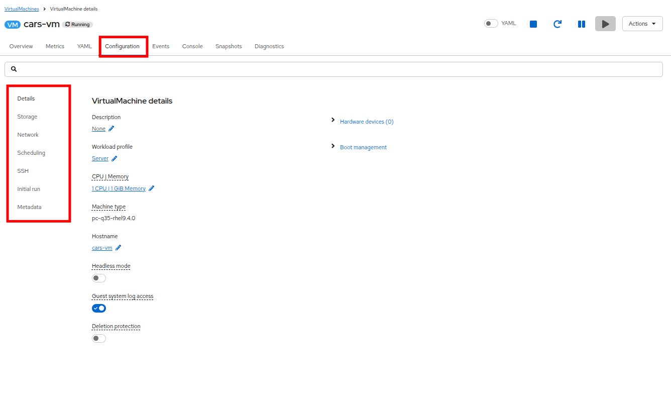 If we return to our virtual machine overview by clicking on Virtualization → VirtualMachines, and click back on our cars-vm we can take a deeper look at the configuration options that can be modified on the VM, by clicking on the Configuration tab.
