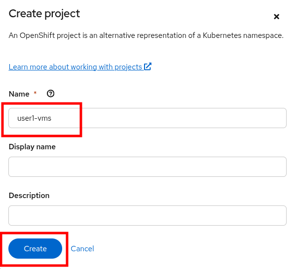 A new window will launch, name your project userX-vms, leave the other fields blank, and click on the Create button.