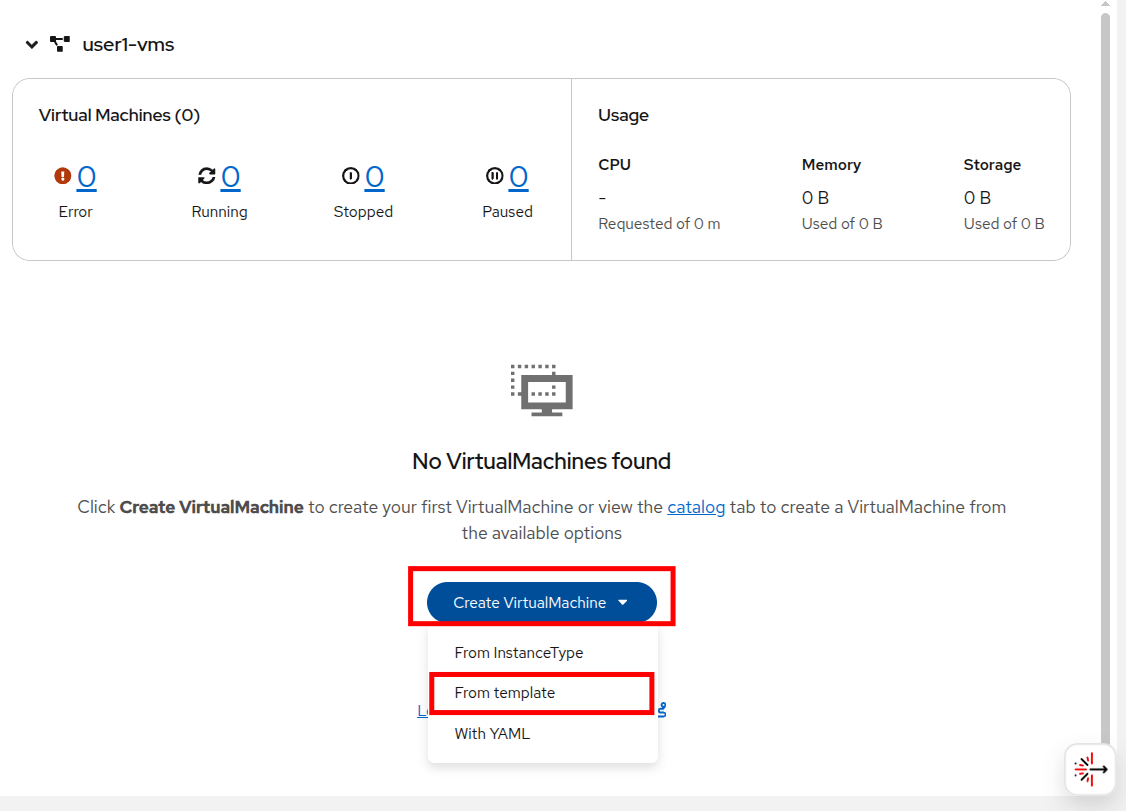 You will be placed in this new project after it is created. Click the Create VirtualMachine button in the middle, and select From template from the dropdown menu to create your virtual machine.