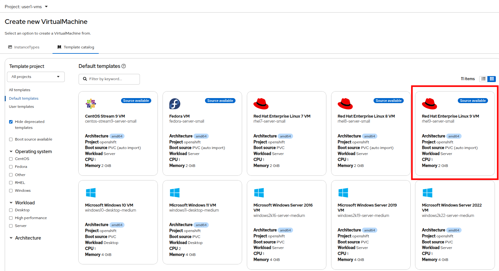 You will see the templates for both Linux and Windows VMs that are available to you arranged in a number of tiles. Click on the Red Hat Enterprise Linux 9 VM tile to create a RHEL9 VM.