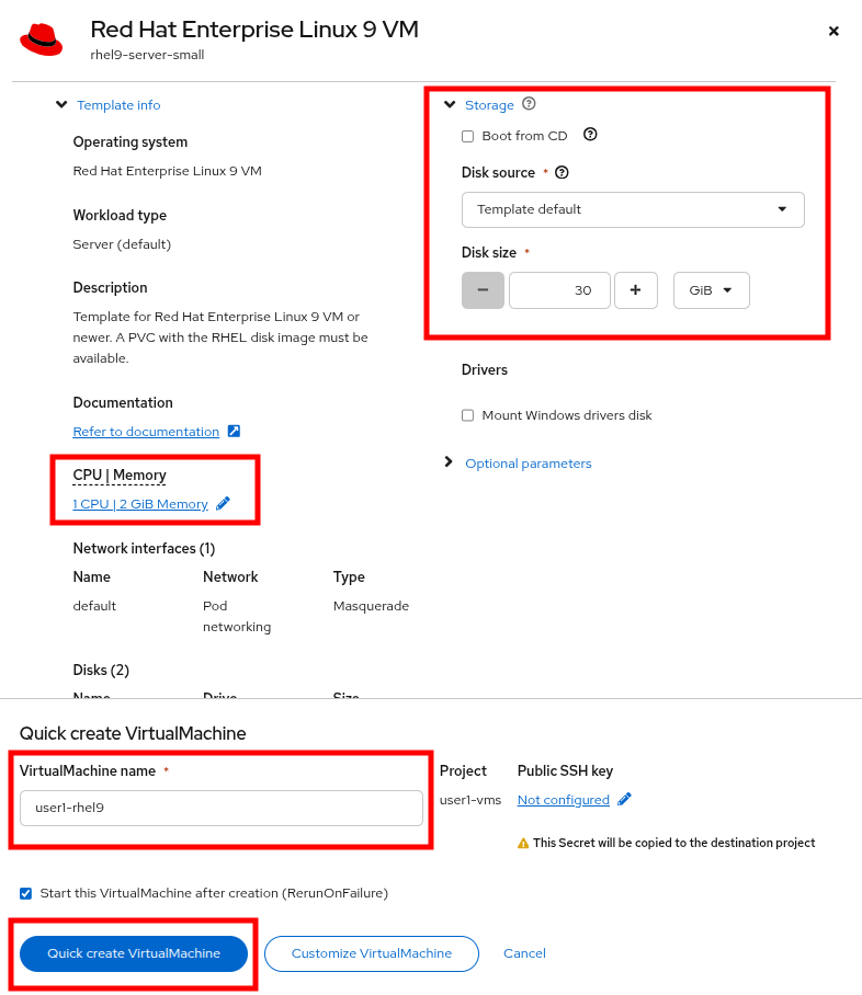 A new window will appear allowing you to configure things like a bootable CD image, modify the disk size of the VM, and configure its CPU and Memory resources as well as name the VM. For the purpose of this exercise, just name the virtual machine userX-rhel9 and click the Quick create VirtualMachine button at the bottom.