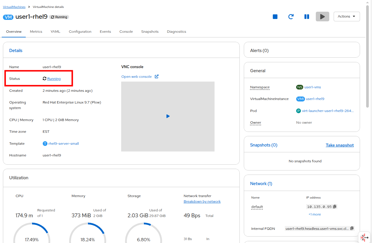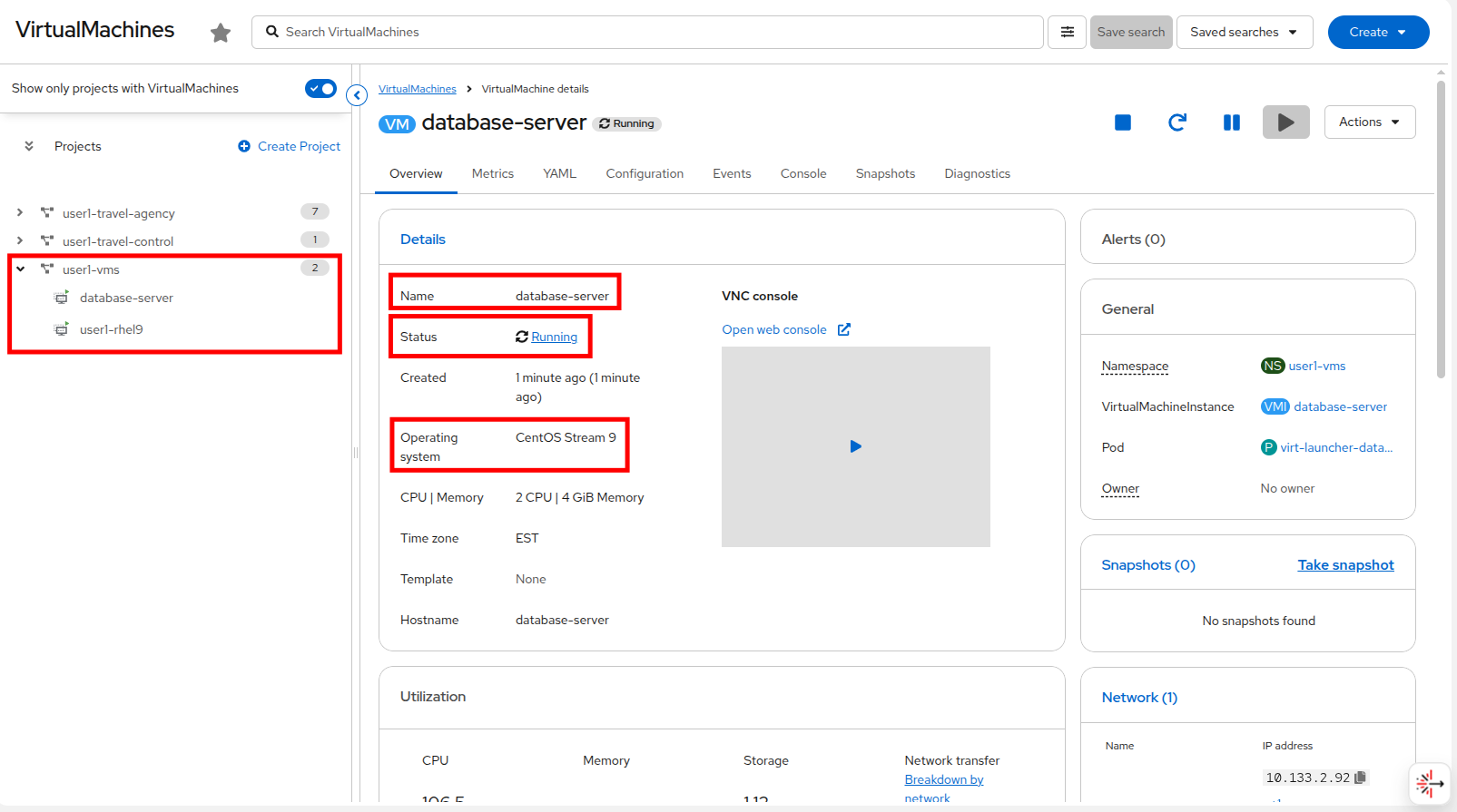 The VM should start provisioning and after a few moments it will enter the Running state. You can see that it was placed in the userX-vms namespace as directed, and is called database-server, and is running the CentOS Stream 9 operating system.
