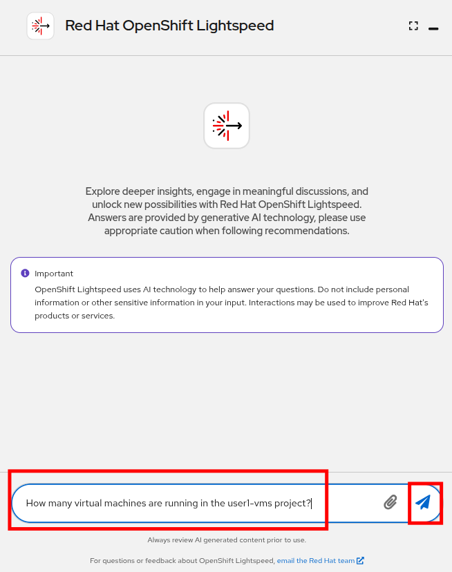 Copy/Paste the following prompt into OpenShift Lightspeed and click the Send button when you are ready.