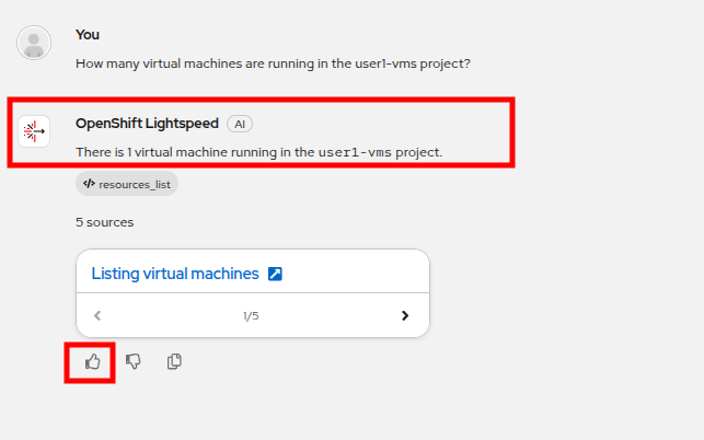 After a few moments, OpenShift Lightspeed should report that there is 1 VM running in that project, which is the one we quick created a moment ago.