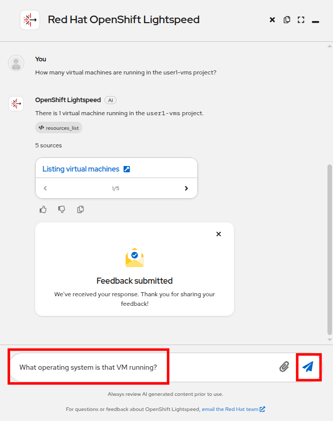 | Notice that OpenShift Lightspeed can continue a series of questions by inferring information from those previously asked. In this example, we did not have to restate the project, or tell it specifically which VM we were referring to in the second prompt. |