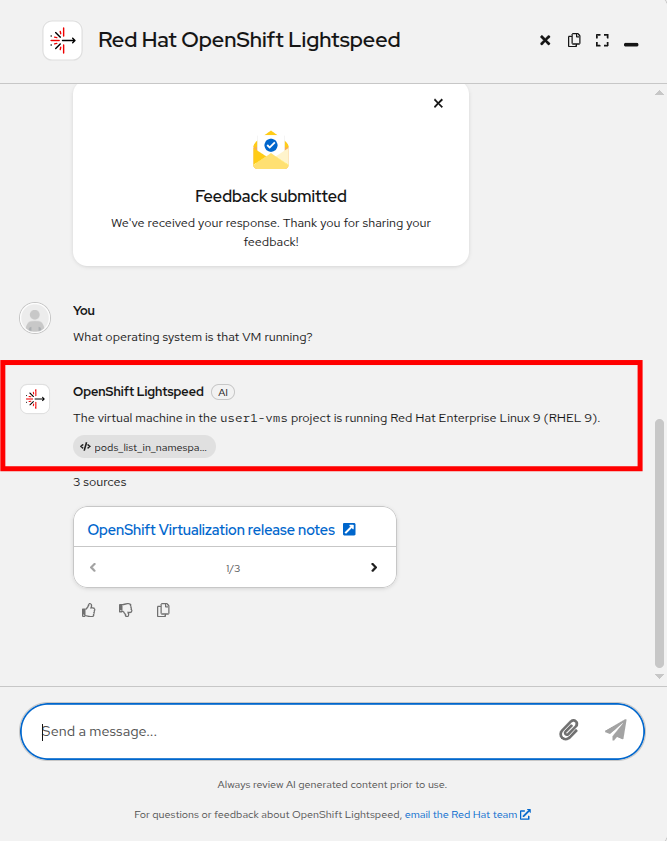 After a few moments, OpenShift Lightspeed will correctly answer that the VM in question is a RHEL9 VM.