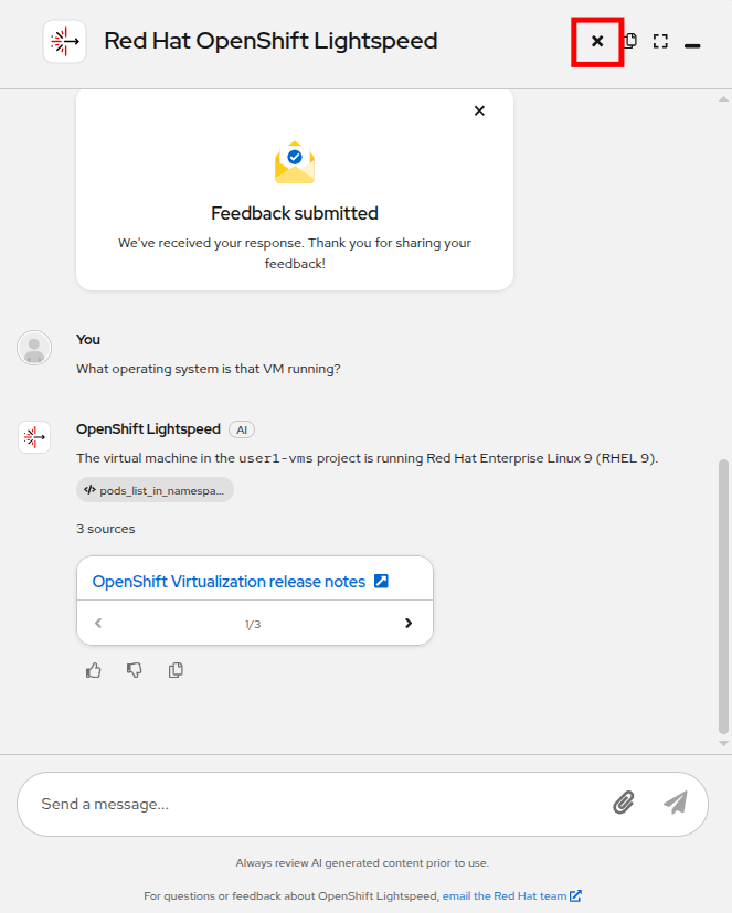 When you are finished, click the x icon in the top right corner to clear the OpenShift Lightspeed prompt history.