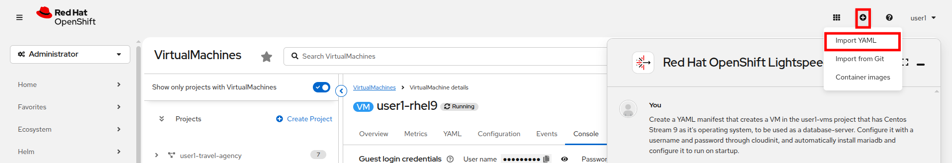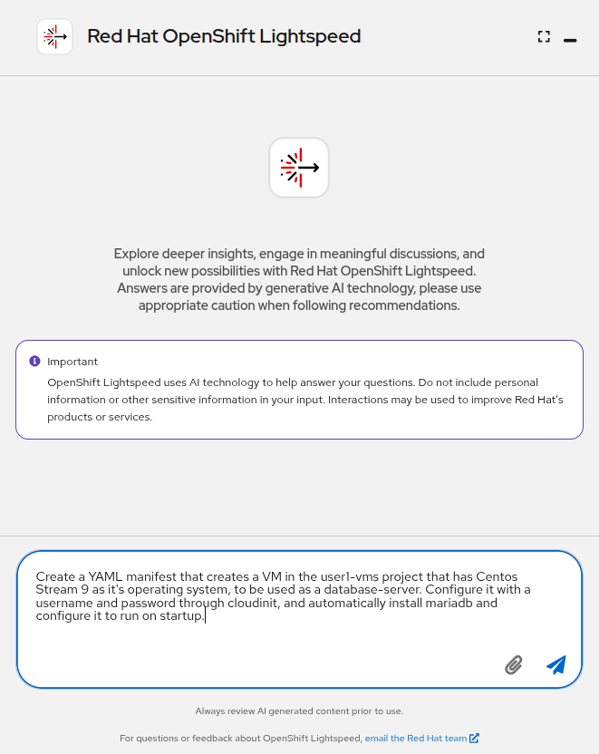 In this task we will provide a prompt to OpenShift Lightspeed to ask it to help us create a virtual machine for a specific purpose. Once it responds, we will use what it provides to create the virtual machine that we need.