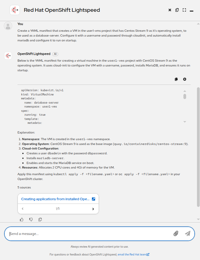OpenShift Lightspeed will respond with with a YAML manifest that can be used to create the VM we have requested and its rationale for providing its answer.