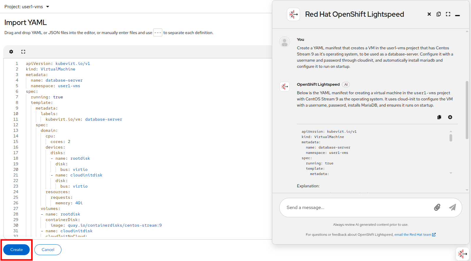 Create a VM from an OpenShift Lightspeed prompt