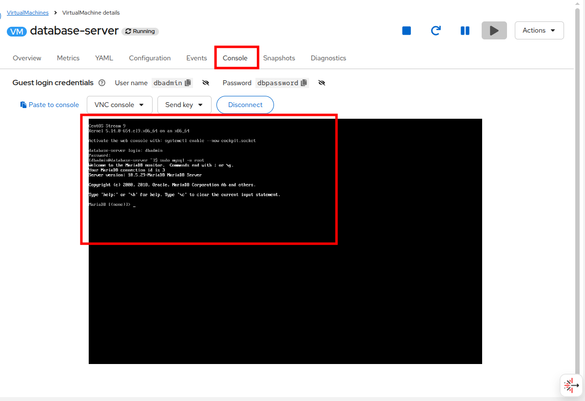 Click on the Console tab, and use the credentials to login, and verify that mariadb is installed, and running by using the following command: