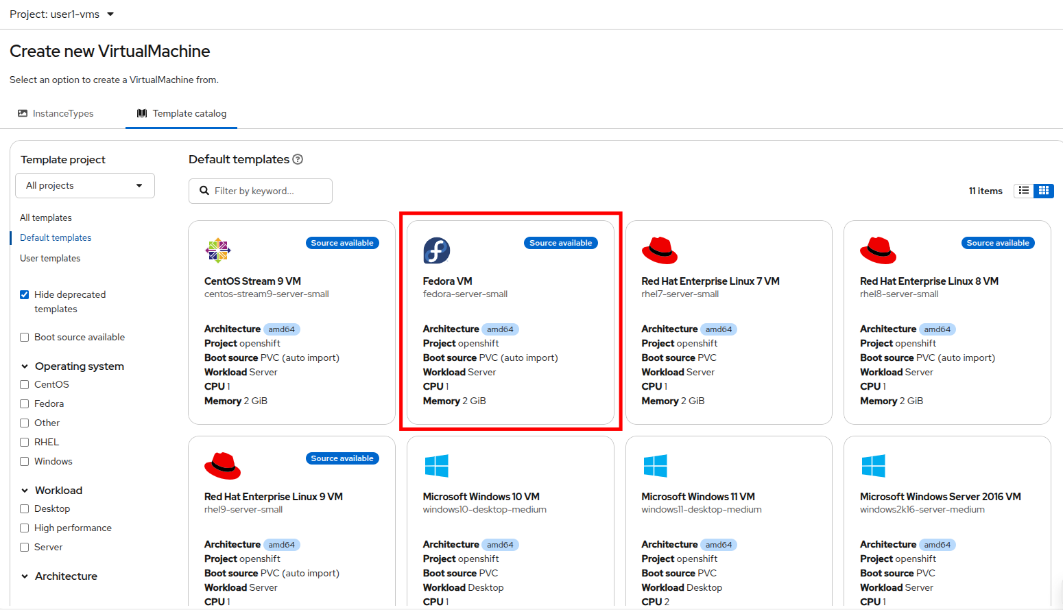 On the Create new VirtualMachine page select the tile for the Fedora VM.
