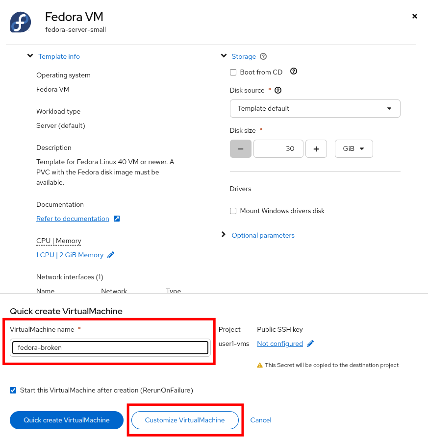 When the Fedora VM dialog appears, name your virtual machine fedora-broken and click the button to Customize VirtualMachine.