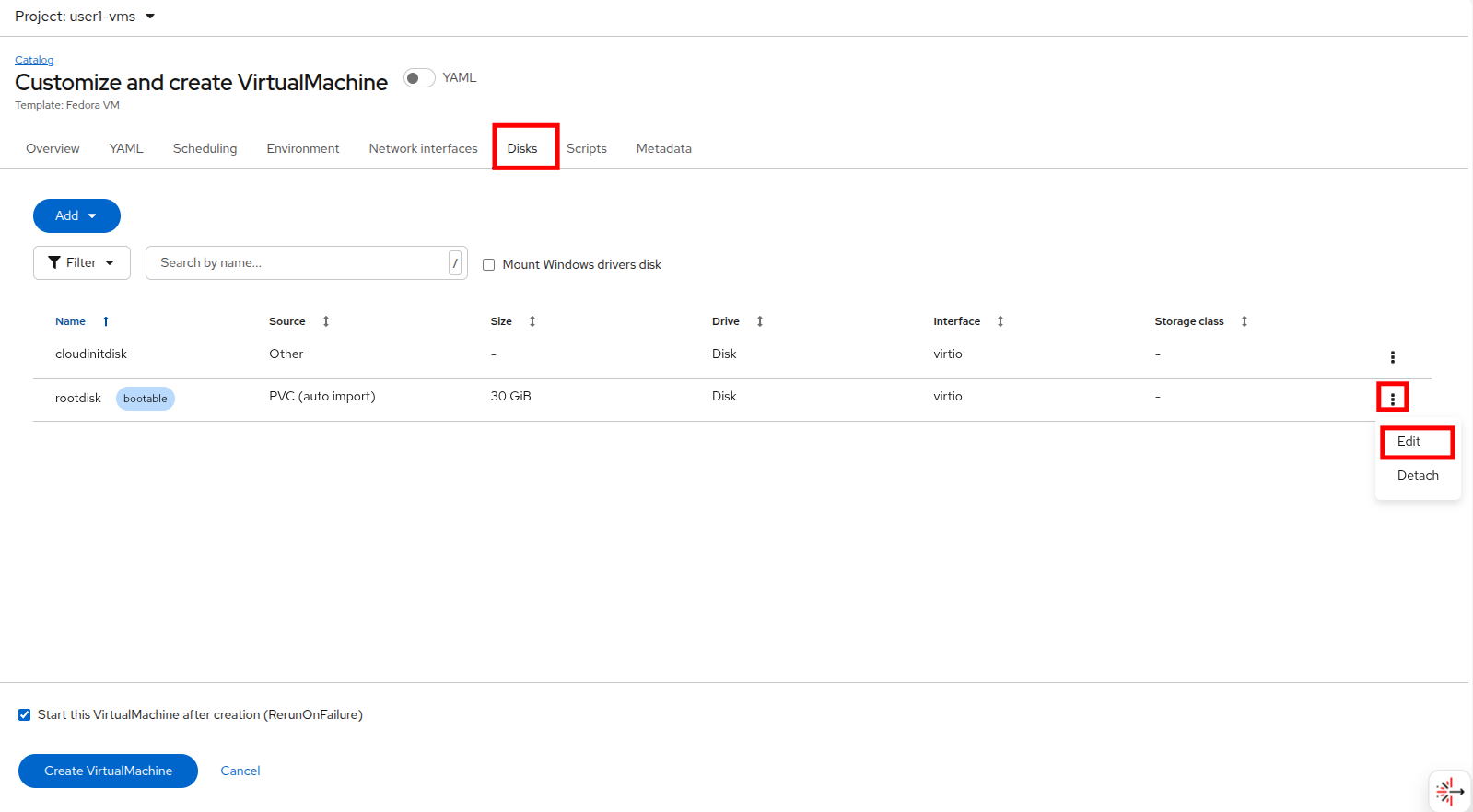 On the Customize and create VirtualMachine page, click on the tab for Disks and next to the default rootdisk click on the three-dot menu and select the Edit option.