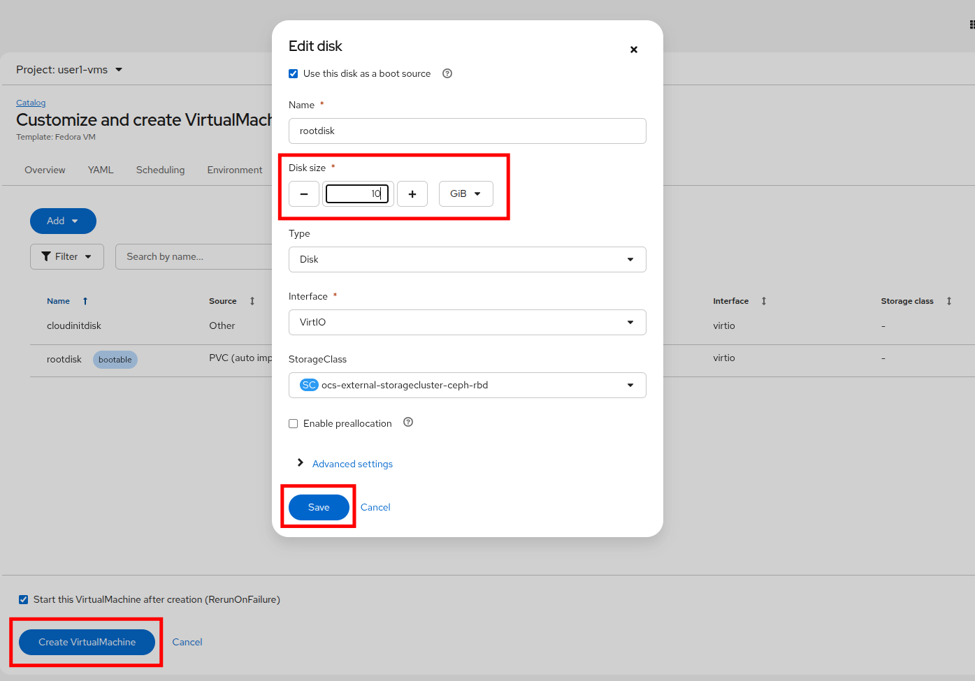 When the Edit disk dialog appears, change the disk size to 10GB, which is too small to provision the VM correctly. Click the Save button on the dialog, and when returned to the main screen, click the Create VirtualMachine button.
