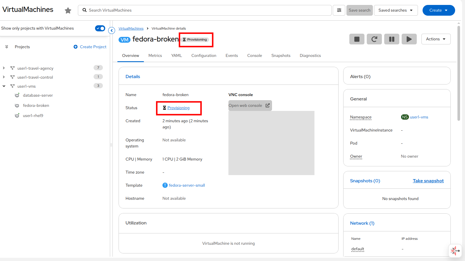 Why is the VM fedora-broken in the userX-vms project failing to boot?