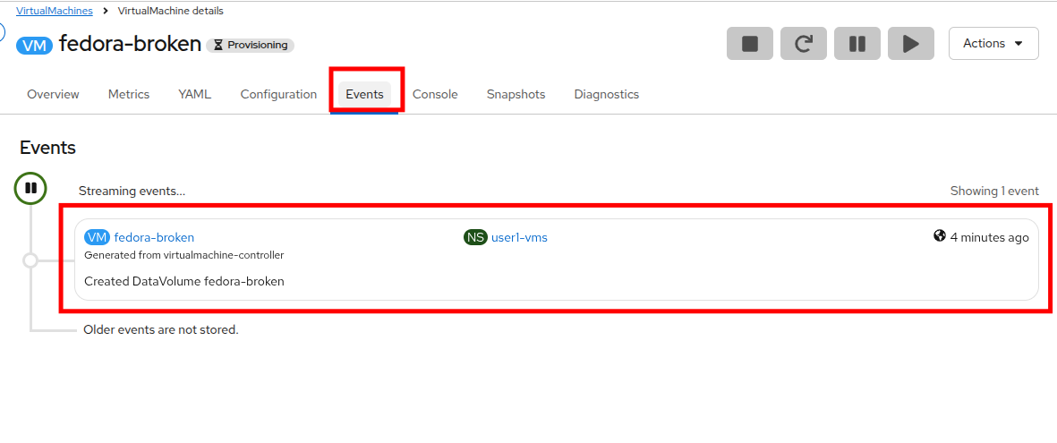 Clicking on the Events tab shows us that the DataVolume was created, and no additional information.