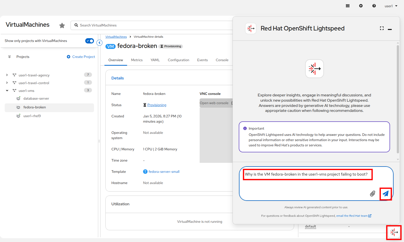 Click on the OpenShift Lightspeed icon in the bottom right corner, and ask it why the VM is unable to boot, and click the Send button.