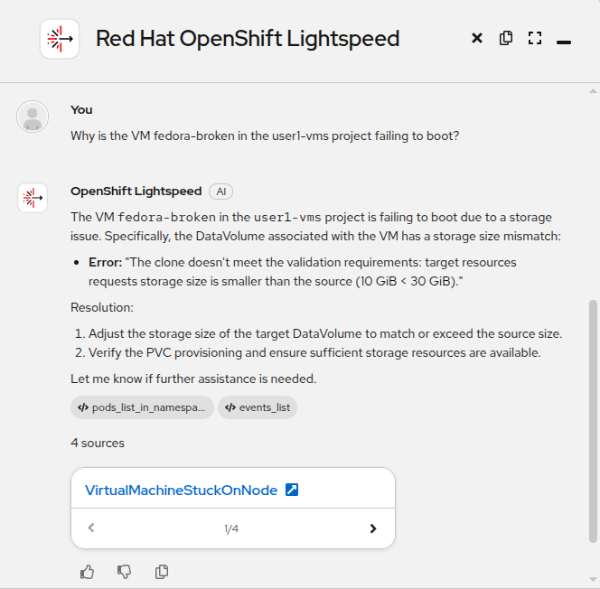 OpenShift Lightspeed is able to diagnose the issue as storage-related, providing an error message about the DataVolume being smaller than necessary, and providing a potential resolution.