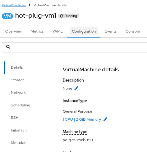 Navigate to Virtualization → Virtual Machines, and select the hot-plug project. Select the VM named hot-plug-vm1. Note that the InstanceType of this VM is u1.small. Above the InstanceType, you can see that the CPU | Memory for this VM is 1 CPU | 2GiB Memory. This is the current configuration for this VM.