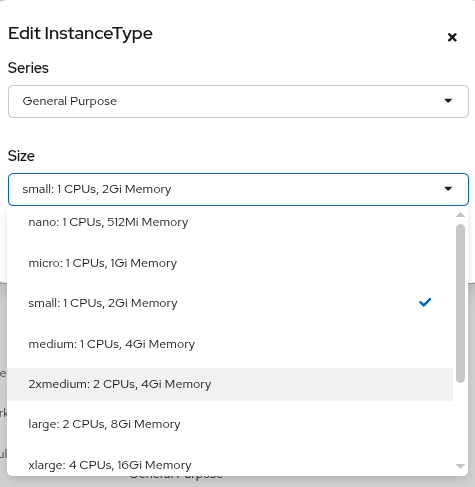 Click on the blue pencil icon to modify the CPU and Memory resources. In the window that appears, pull down the Size menu and select 2xmedium: 2CPUs, 4Gi Memory. Click the Save button.