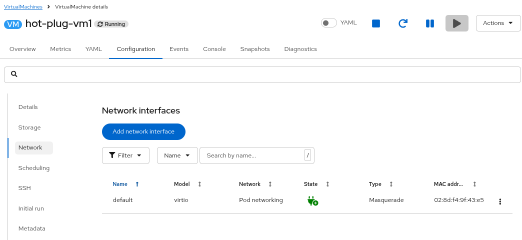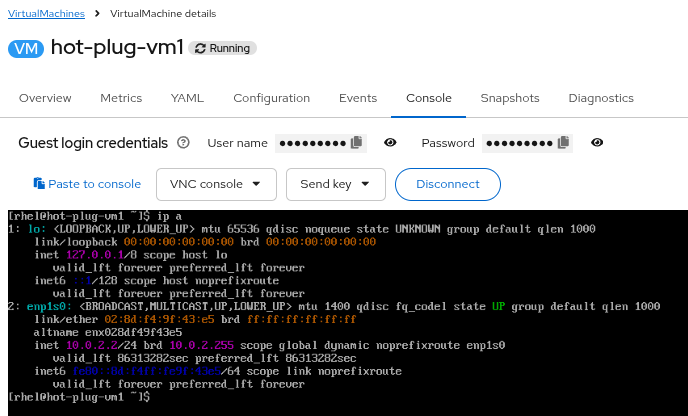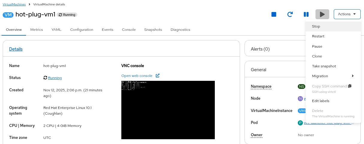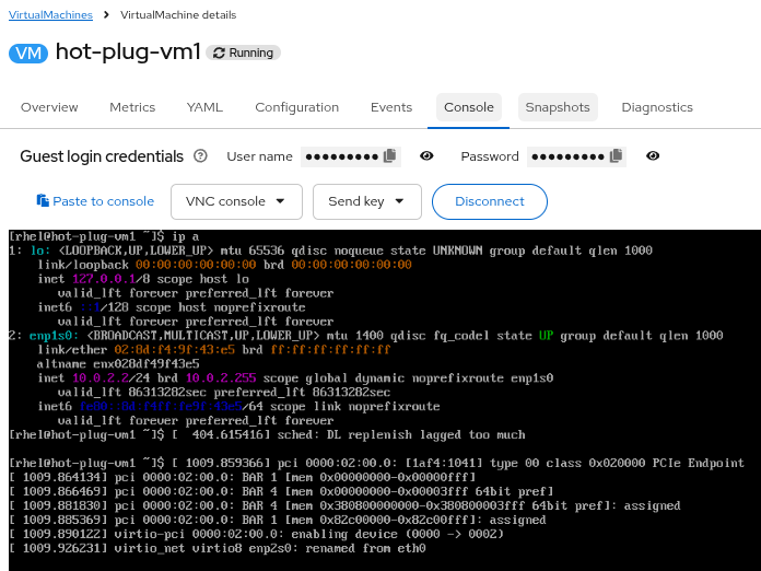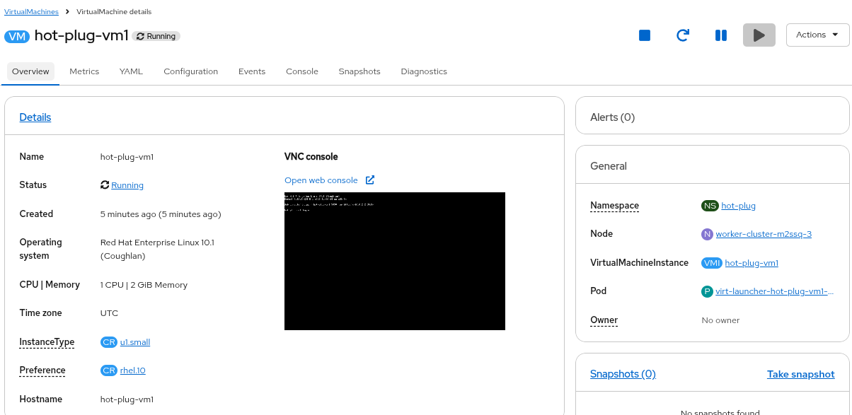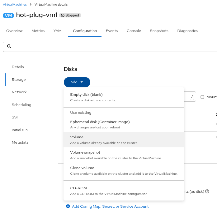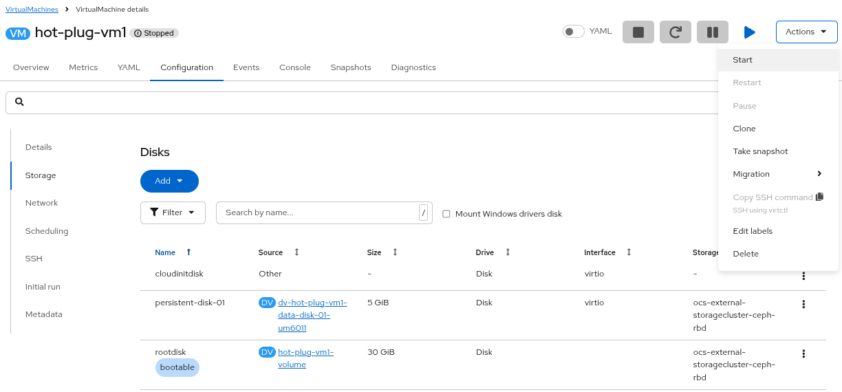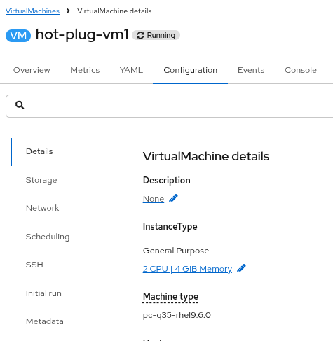 Navigate to Virtualization → Virtual Machines, and select the hot-plug project. Select the VM named hot-plug-vm1.